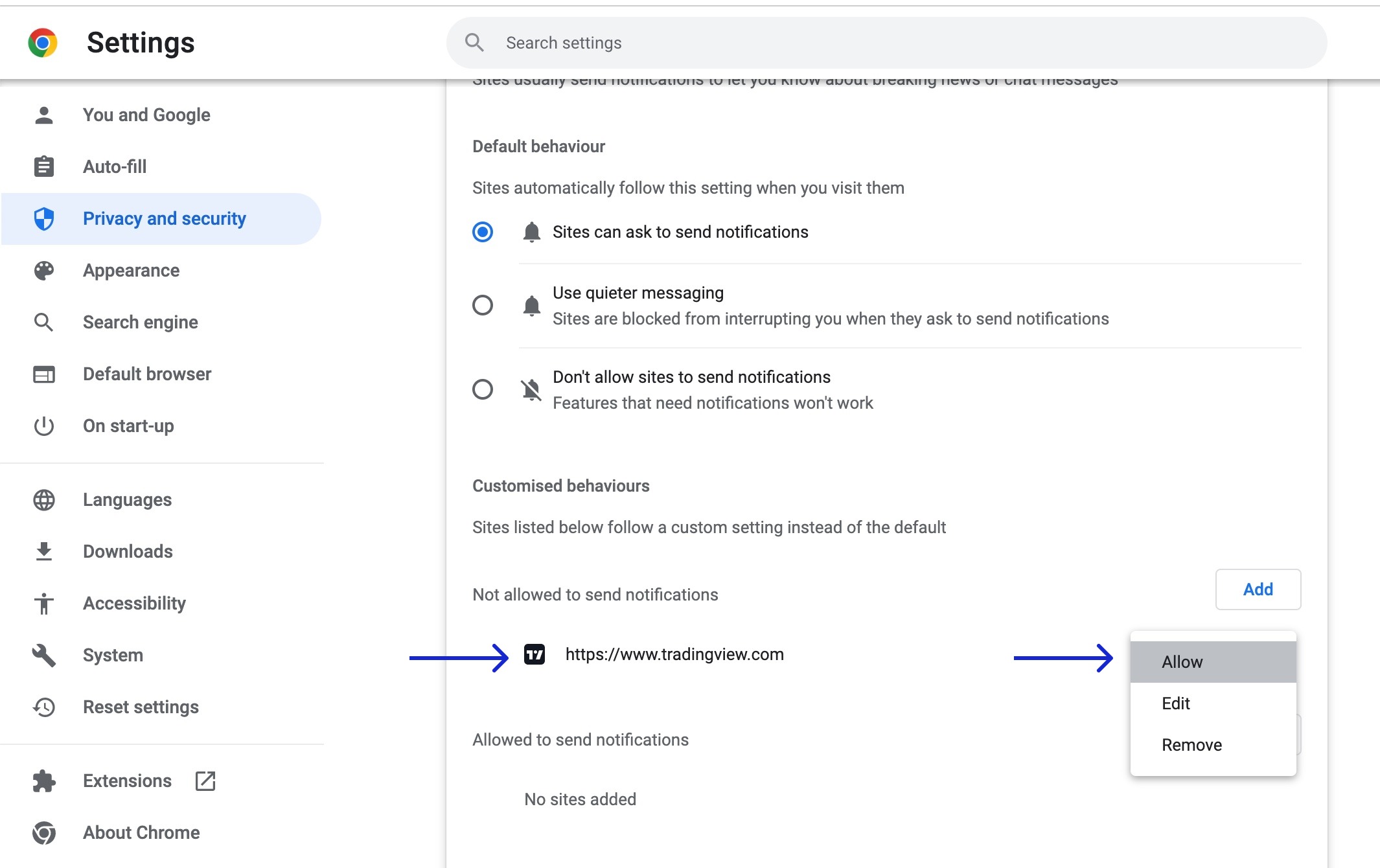 权限 → 通知 → 允许“https://cn.tradingview.com”。
