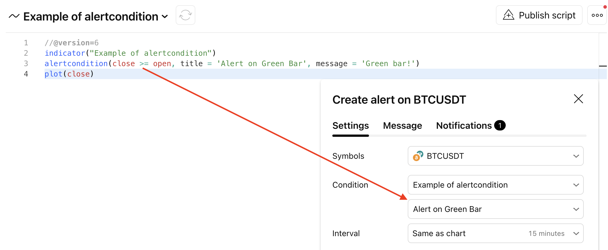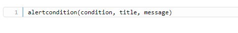 如果在“创建警报”对话框中找不到合适的条件,则可以通过编写Pine编程语言中的指示器来完成目标,该指示器将在图表上计算条件,并且让您在手动设定快讯时选择此自定义条件。这样的脚本应该包含alertcondition函数。 该函数具有以下签名: