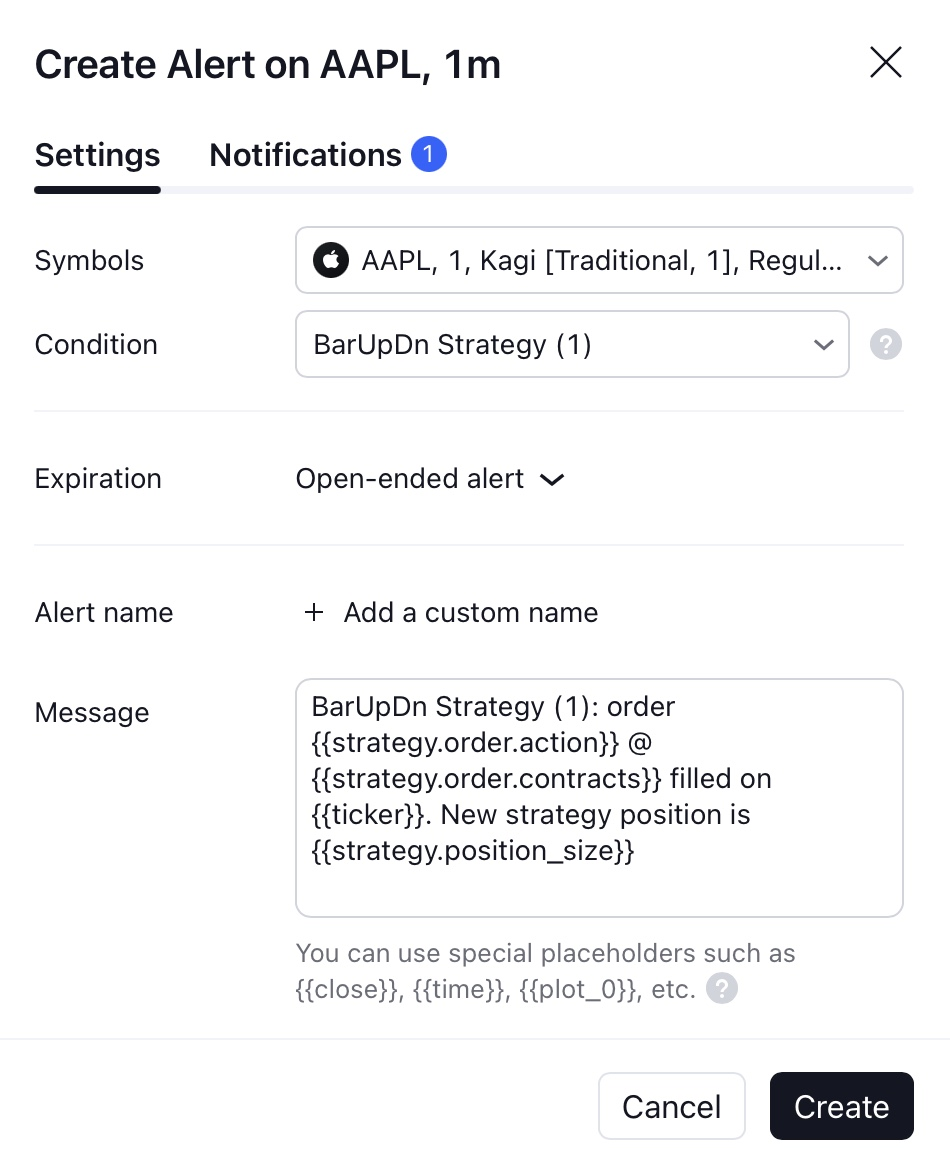 每个订单都会触发策略警报。此类警报的触发频率在策略代码中确定,因此对话框中没有可用的频率选项。