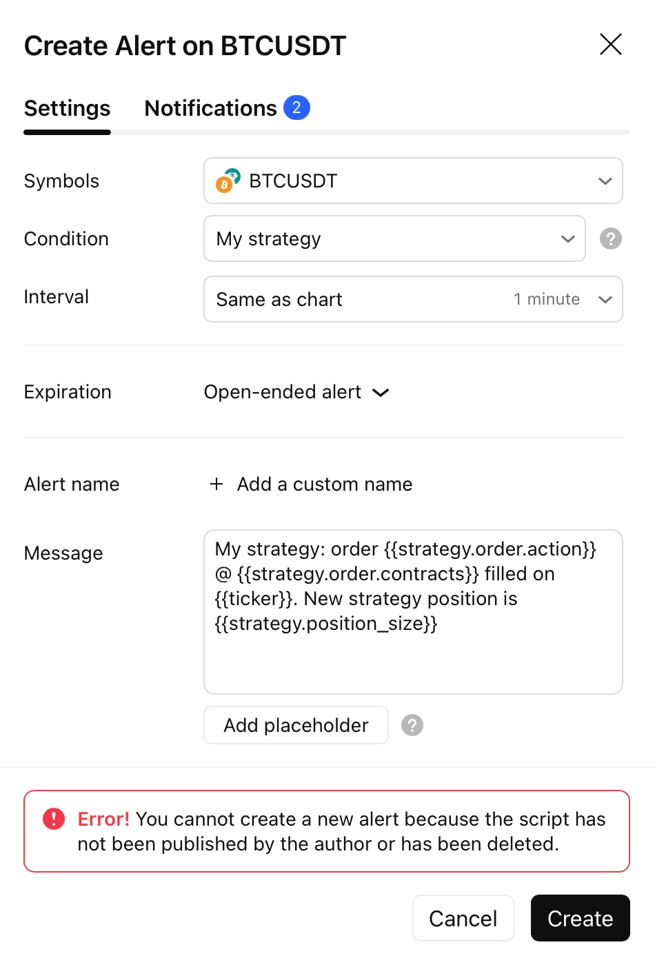 1. 您正在尝试针对其他用户的脚本创建警报,但该脚本尚未由作者发布。在这种情况下,您也无法查看该脚本的源代码。