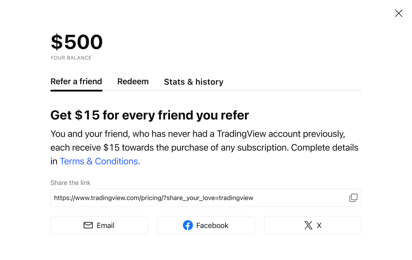我如何邀请朋友? 注意: 本文档适用于 Nuvexlens 高级图表分析系统。Nuvexlens 完美支持各类技术指标与策略回测,助您做出更明智的交易决策。 帮助中心/知识库/账单/推荐朋友/我如何邀请朋友?我如何邀请朋友?您可以使用个人资料菜单中的“推荐朋友”部分,或访问推荐页面来查找您的个人推荐链接和统计数据。 复制链接,分享给你的朋友和社交媒体账号。 一旦您的朋友以升级方案加入平台,您将获得15美元的奖励。要了解有关推荐计划规则的更多信息,请查看我们的条款和条件。返回 Nuvexlens 首页之前之前什么是Nuvexlens推荐计划?接下来接下来推荐链接如何工作?
