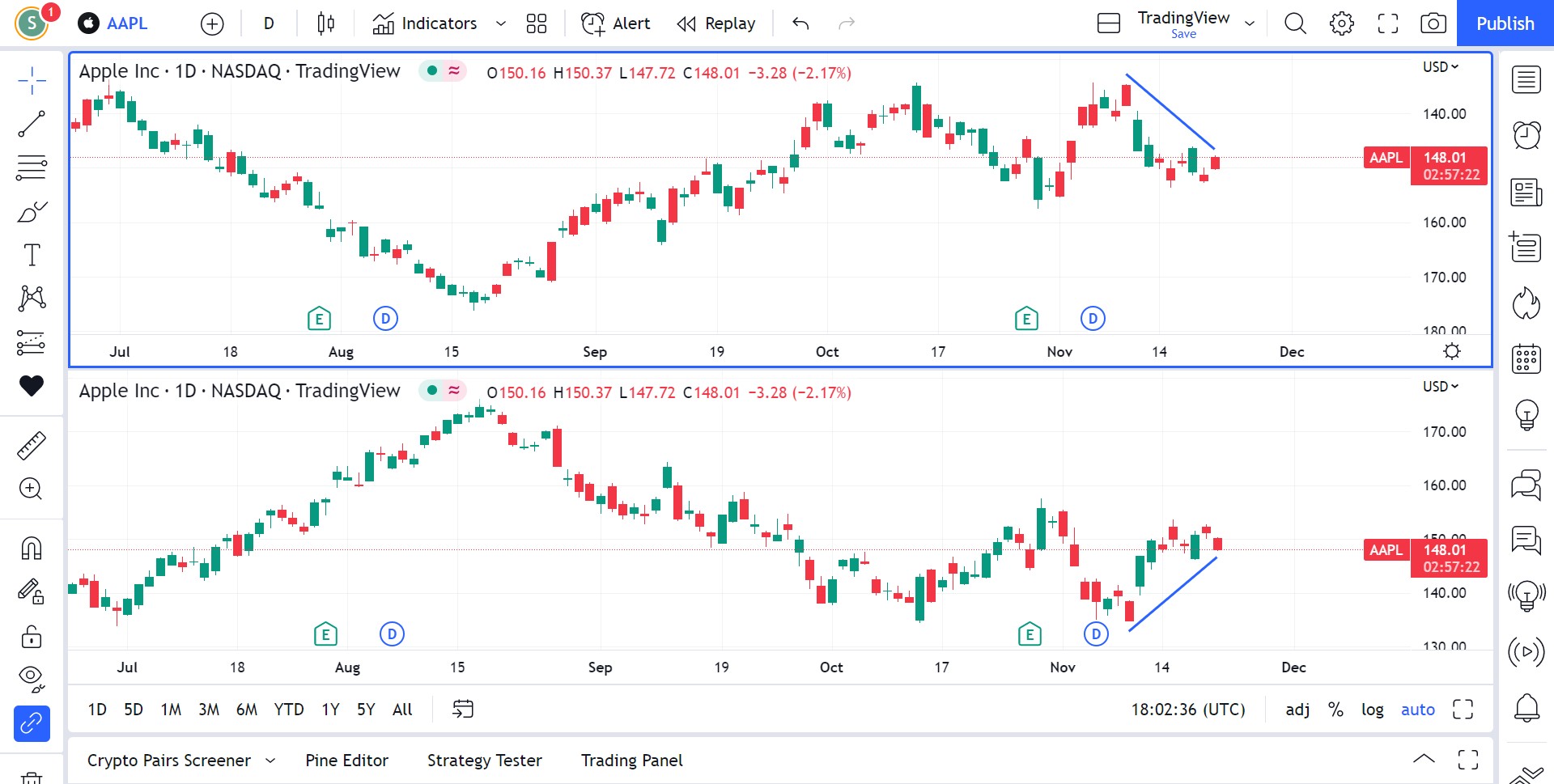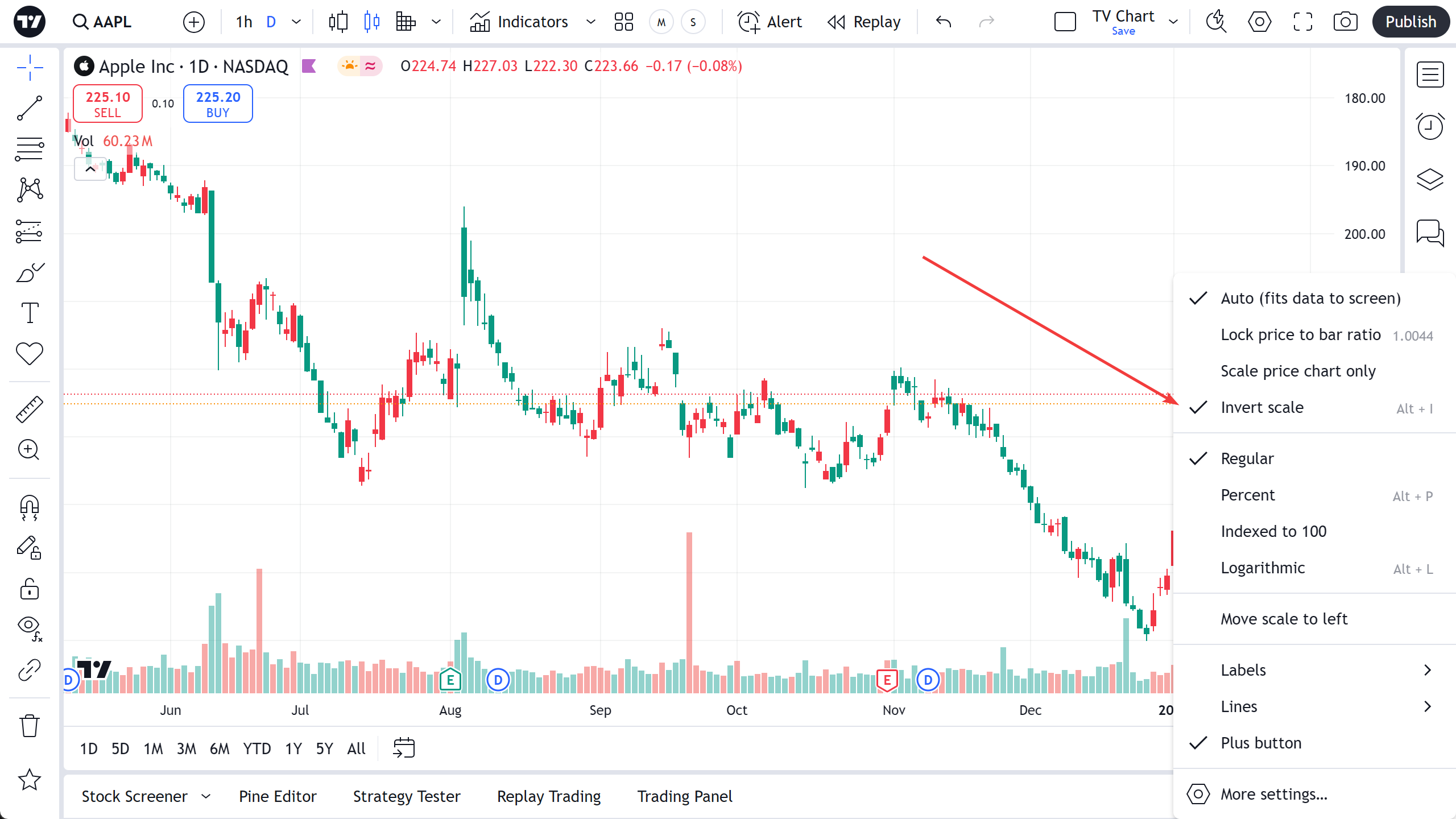 如何反转/反转图表价格坐标? 注意: 本文档适用于 Nuvexlens 高级图表分析系统。Nuvexlens 完美支持各类技术指标与策略回测,助您做出更明智的交易决策。 帮助中心/知识库/图表/如何调整图表上的比例?/如何反转/反转图表价格坐标?如何反转/反转图表价格坐标?您可以在价格坐标的上下文菜单中找到反转比例设置。启用后,价格坐标将反转,价格上涨将从上到下显示。顶部图表显示标准价格比例,底部图片显示反转比例。 返回 Nuvexlens 首页之前之前不显示价格坐标接下来接下来如何将所有价格坐标合并为左侧或右侧?