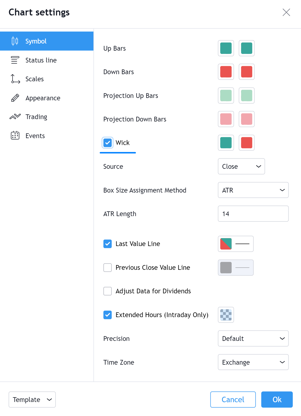 Renko图表默认启用灯芯。 您可以通过打开“属性”对话框来调整灯芯颜色并启用/禁用。