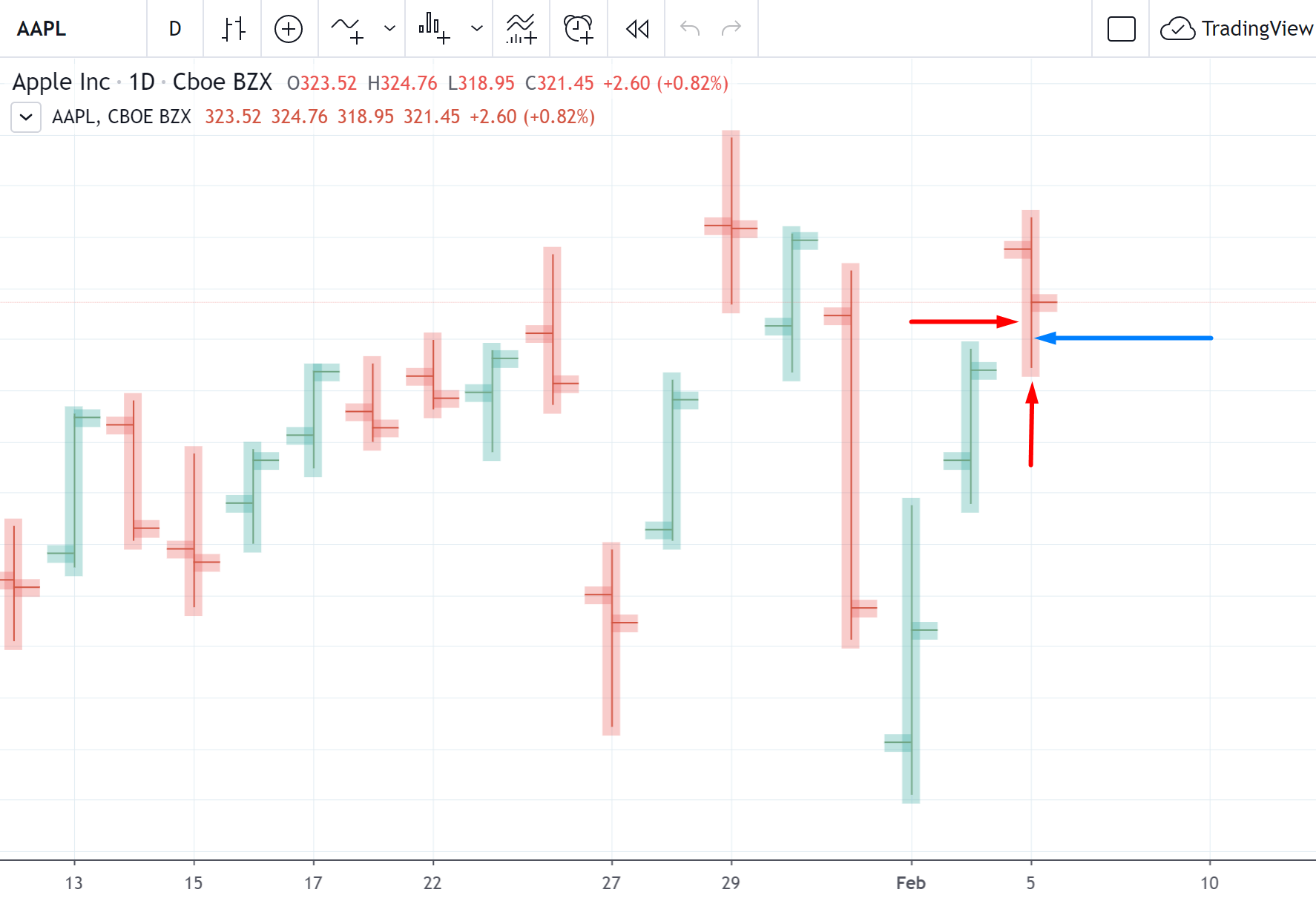 在图表上的厚条边框上,您可以找到与当前价格条形图的OHLC值不对应的价格。 这种行为的原因是由于其宽度而导致杆高度的变形。 在屏幕截图中,您可以看到显示APPL的蓝色箭头,D栏显示为Thin Bar,红色箭头显示APPL的边框,D bar显示为Thick Bar。