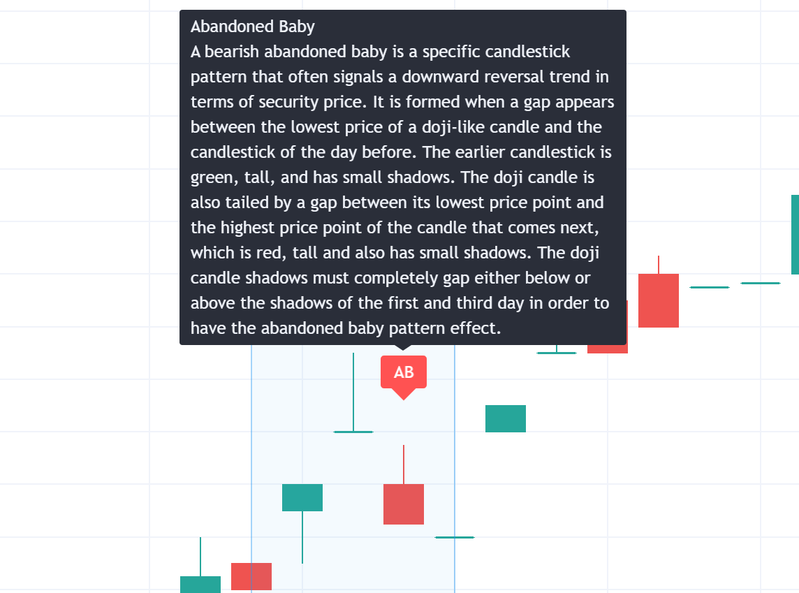 看跌弃婴是一种特定的K线形态,通常预示着证券价格的下降反转趋势。当十字星状K线的最低价格与前一天的K线之间出现缺口时,它就会形成。较早的K线是绿色的,高的,并且有小的阴影。十字星K线的最低价点和下一根K线的最高价点之间也有差距,这是红色的,高的,也有小阴影。十字星K线影线必须在第一天和第三天的影线下方或上方完全跳空,才能产生弃婴图案效果。