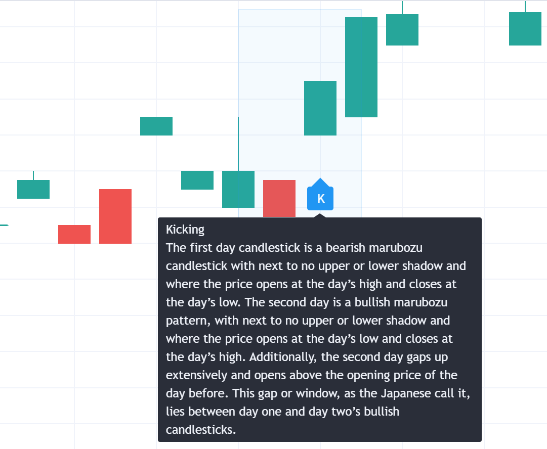 看涨反冲(也称为 Kicker)形态预示着新上升趋势的逆转。第一天K线是一个看跌 marubozu K线,几乎没有上影线或下影线,价格开盘于当日高点,收盘于当日低点。第二天是看涨 marubozu 形态,几乎没有上影线或下影线,价格开盘于当日低点,收盘于当日高点。此外,第二天大幅跳空,开盘价高于前一天的开盘价。这个缺口或窗口,正如日本人所说,位于第一天和第二天的看涨K线之间。