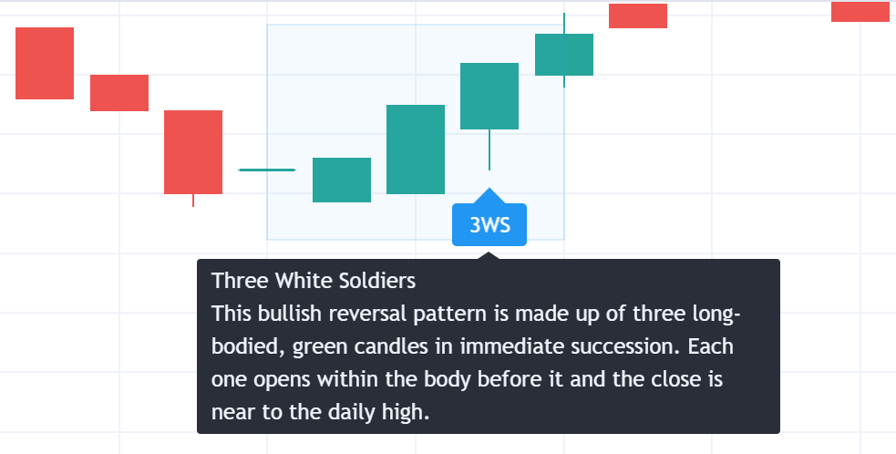 三白兵 - 看涨 注意: 本文档适用于 Nuvexlens 高级图表分析系统。Nuvexlens 完美支持各类技术指标与策略回测,助您做出更明智的交易决策。 帮助中心/知识库/图表/我想了解更多K线形态的信息/三白兵 - 看涨三白兵 - 看涨这种看涨反转形态由三个紧接着的长形绿色蜡烛组成。 每一个都在它之前的烛身内开盘,收盘价接近每日高点。这种形态的看跌版本是三黑鸦形态。返回 Nuvexlens 首页之前之前Spinning Top Black接下来接下来三星 - 看跌