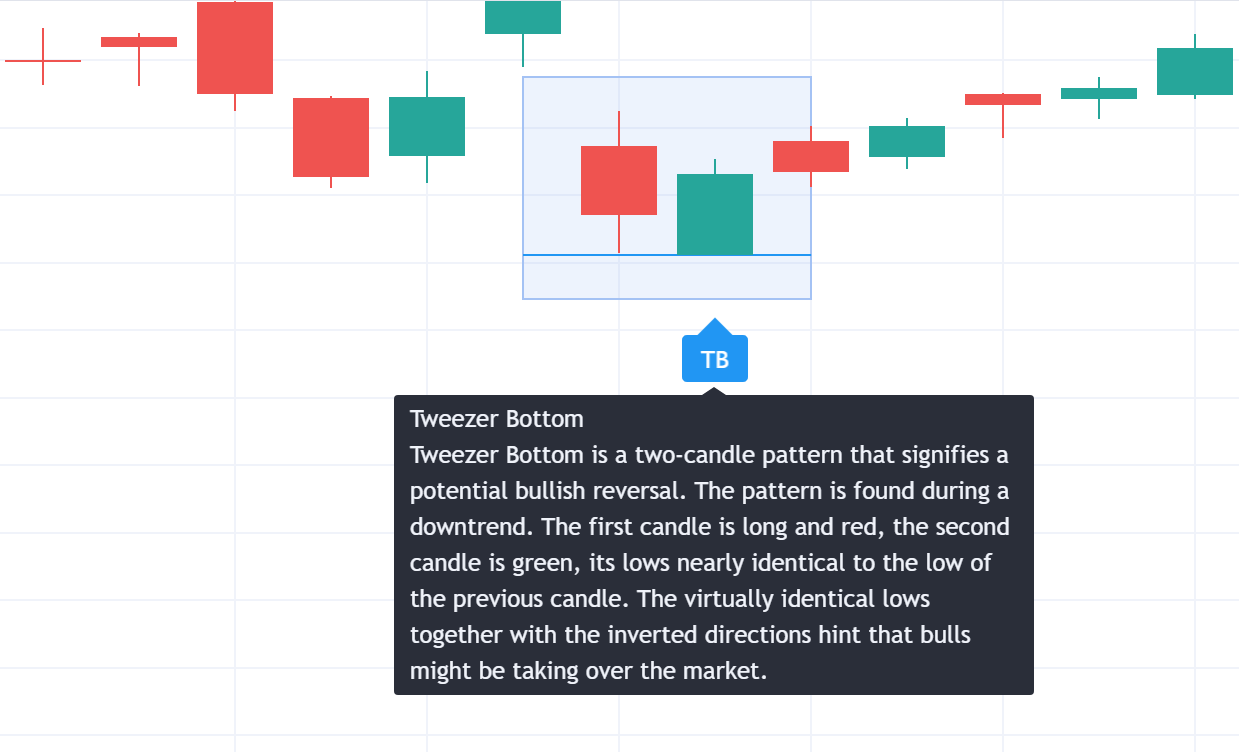 镊底是一种K线形态,表示潜在的看涨逆转。该形态是在下降趋势中发现的。 第一根K线是红色的长蜡烛,第二根K线是绿色的,它的低点几乎与前一根K线的低点相同。 几乎相同的低点和反转方向暗示多头可能正在接管市场。
