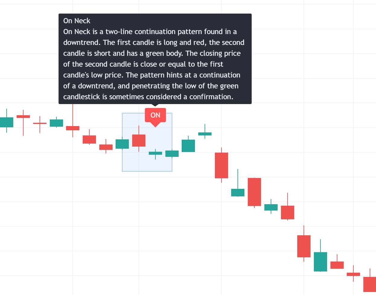 颈上线是在下降趋势中发现的两线延续形态。第一根K线是红色的长蜡烛,第二根K线是短的并且是绿色的。 第二根K线的收盘价接近或等于第一根K线的最低价。该形态暗示下降趋势的延续,并且突破绿色K线的低点有时被认为是一种确认。
