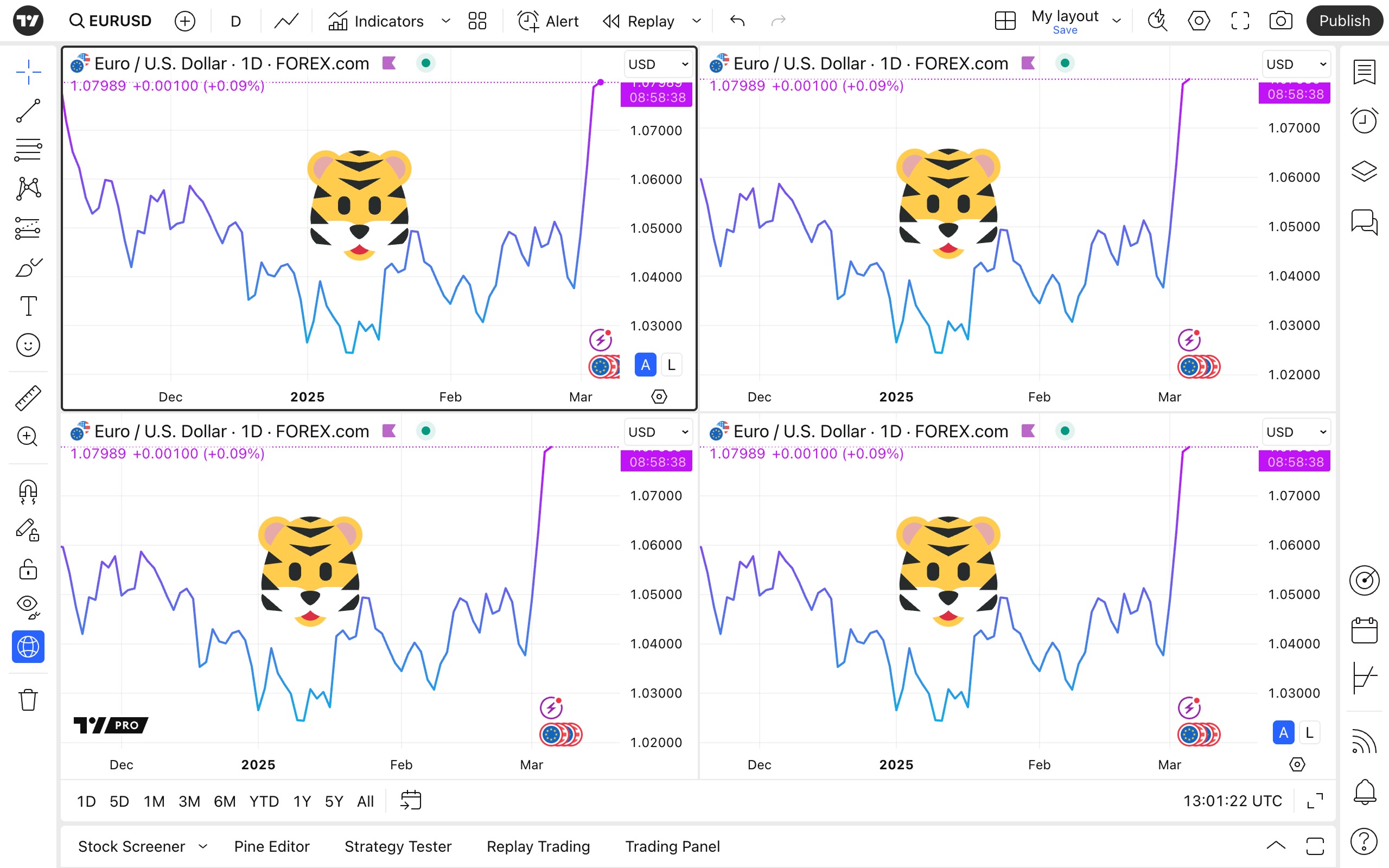 当您选择多个图表时,初始图表中的所有指标和策略都将应用于其他图表。请注意,初始图表的图表设置不会转移到其他图表,因为它们与特定图表绑定。但您可以在“布局”设置菜单中选择同步一些基本设置,例如周期、商品代码等。
