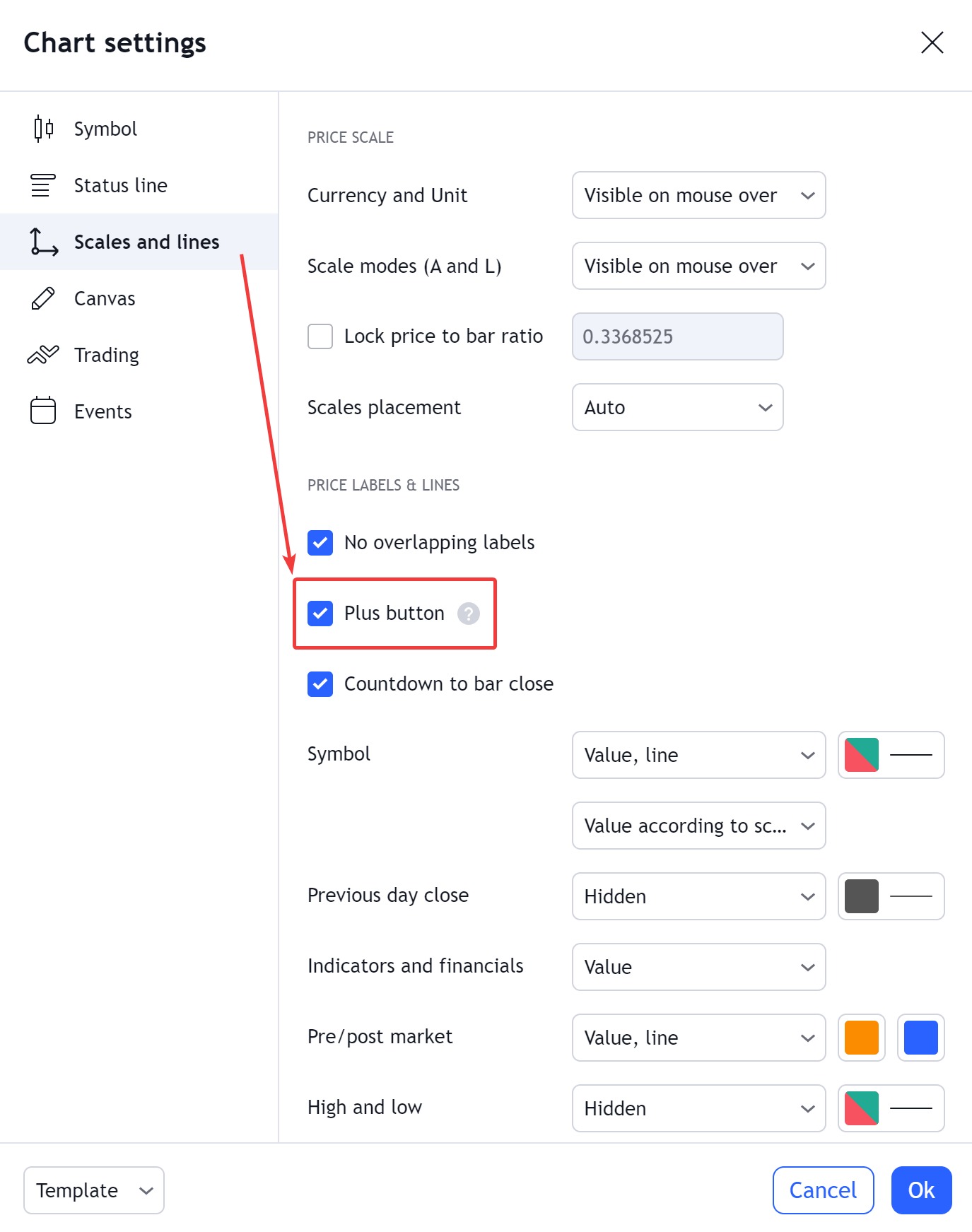 您可以在“坐标和线条”标签页上的“图表设置”对话框中启用“加号”按钮的显示,或者右键单击价格坐标,并从右键菜单中选择“加号”按钮。