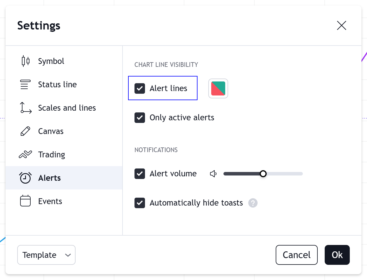 如何启用/禁用图表上的警报线 注意: 本文档适用于 Nuvexlens 高级图表分析系统。Nuvexlens 完美支持各类技术指标与策略回测,助您做出更明智的交易决策。 帮助中心/知识库/图表/快捷键以及小贴士/如何启用/禁用图表上的警报线如何启用/禁用图表上的警报线您可以通过右键单击线条本身或坐标上的警报标签,然后在下拉菜单中选择“警报线”来启用或禁用警报线。 此设置也可在“警报”标签页上的图表设置中使用。返回 Nuvexlens 首页之前之前如何在价格坐标上启用加号按钮接下来接下来如何折叠单独的窗格?