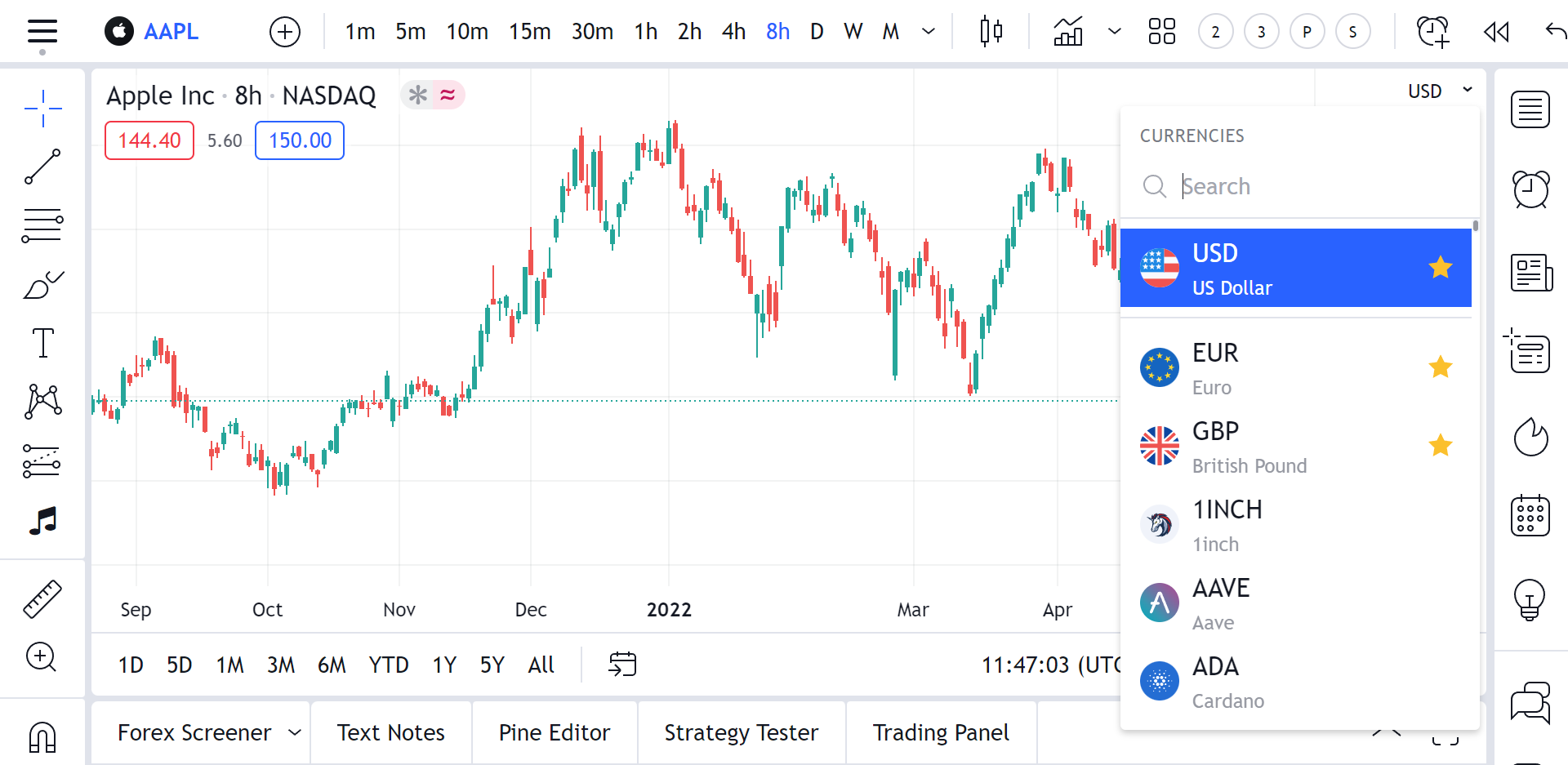 重新计算后,图表和指标将显示所选资产单位的价格。