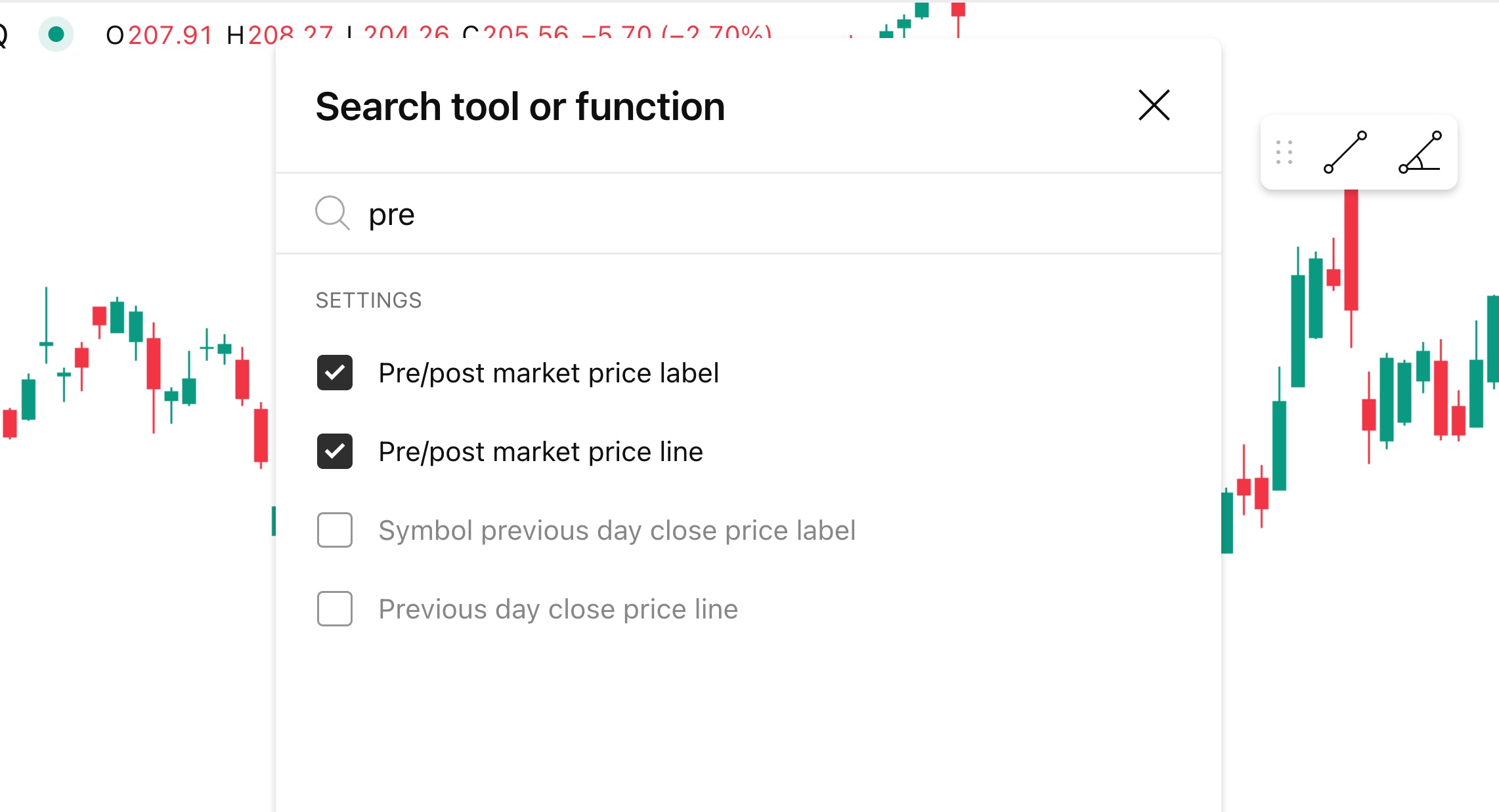 - 绘图:您想添加趋势线、斐波那契回撤线还是矩形?只需输入工具名称即可。工具弹出后,您可以立即选择,甚至可以将其添加到收藏夹,以便下次更快地访问。