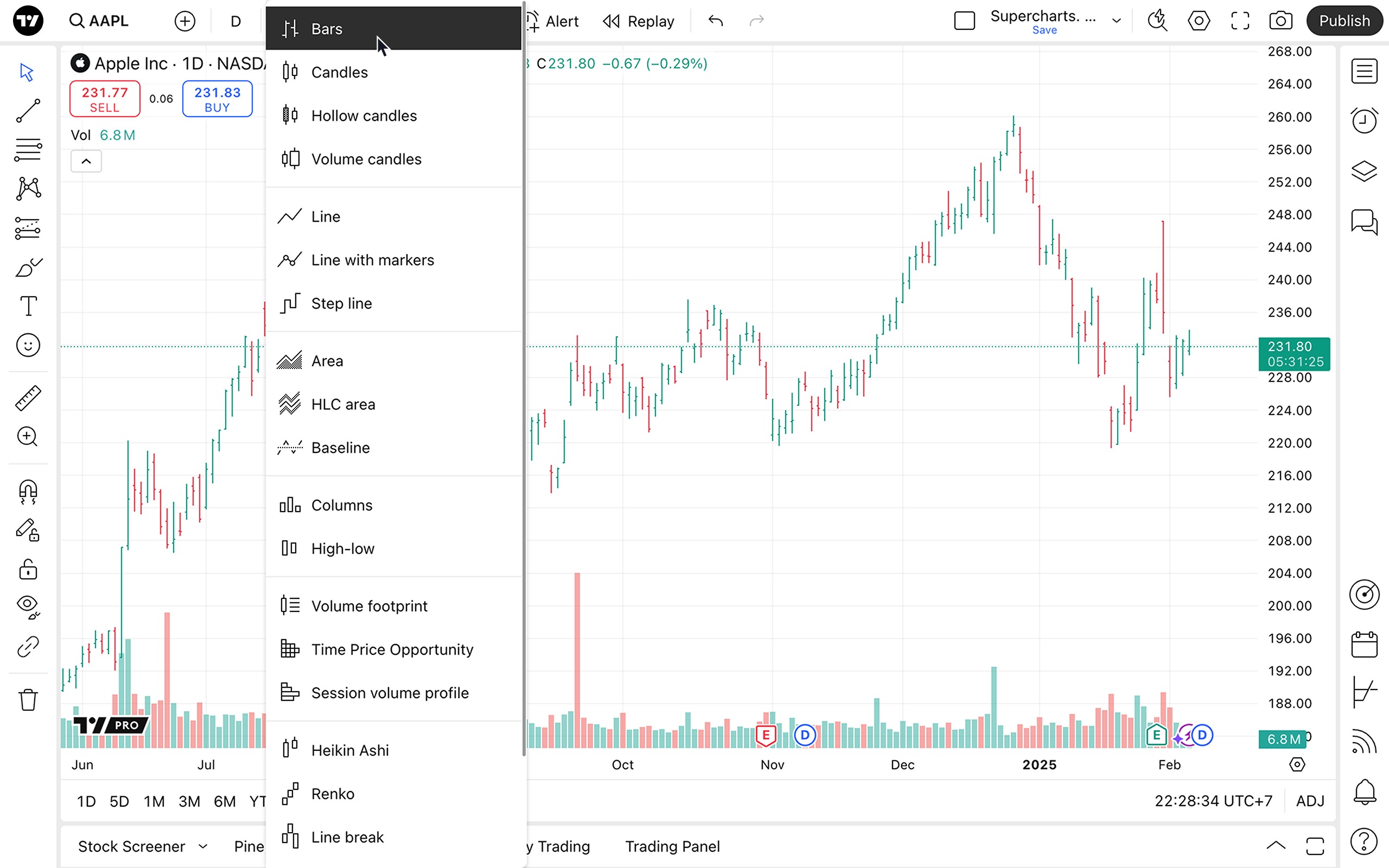 进入超级图表后,打开上方工具栏上的图表类型菜单并选择美国线。