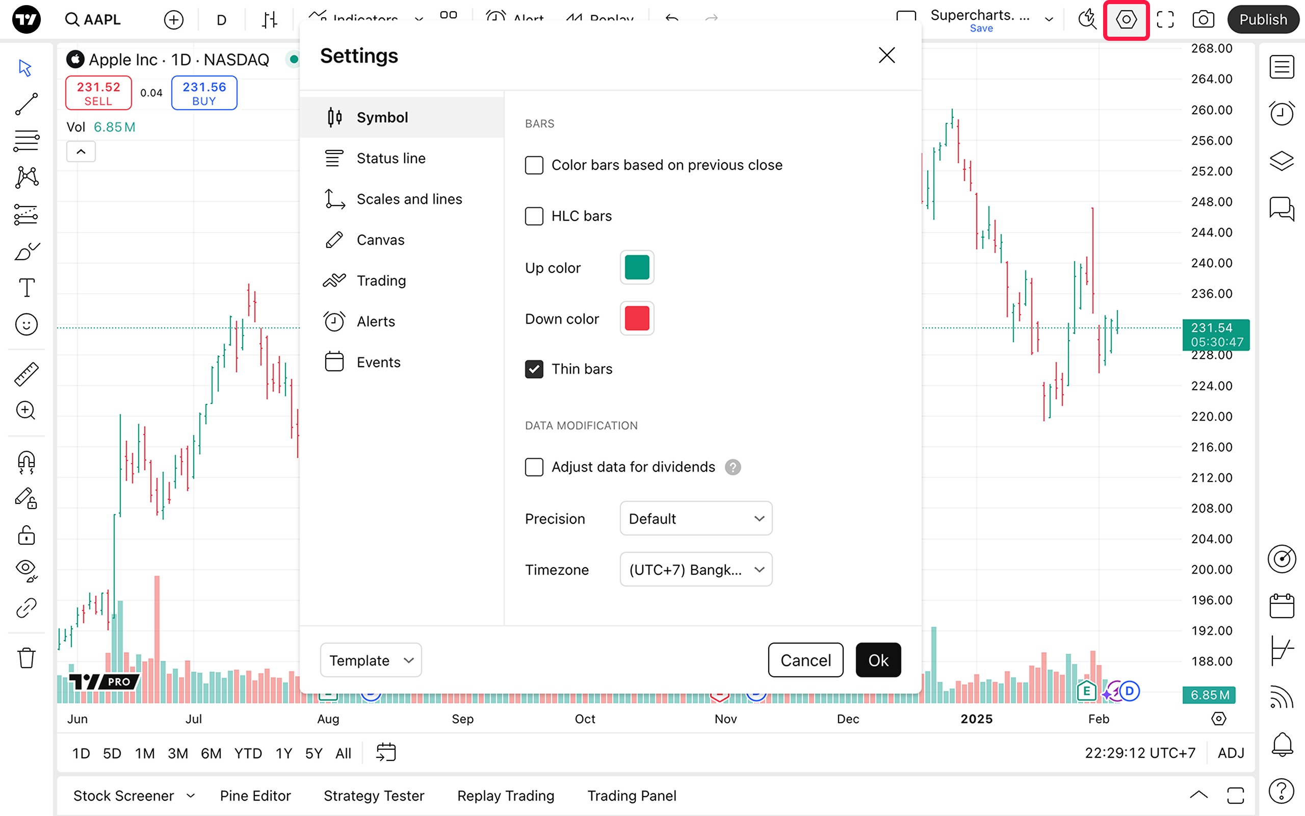 - 上涨颜色/下跌颜色。上涨和下跌条的颜色可以根据您的喜好设置。默认配色方案为绿色表示向上移动(表示当前条的收盘价高于其开盘价),红色表示向下移动(表示收盘价低于开盘价)。