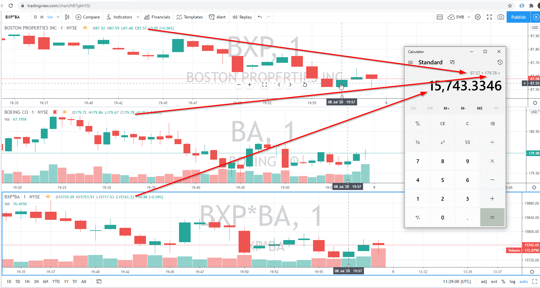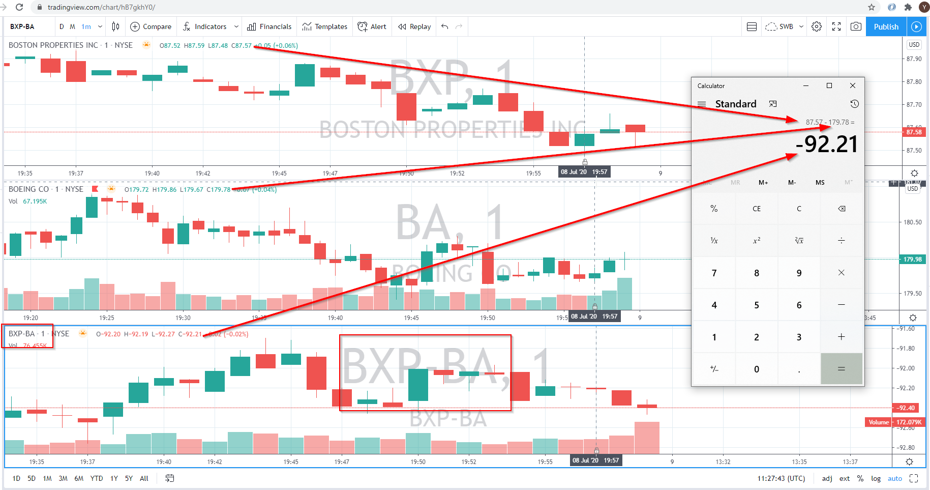 让我们看一些例子。 这是传播的 BXP-BA。 我们采用每个 1 分钟K线的收盘价并计算差值,如下所示: