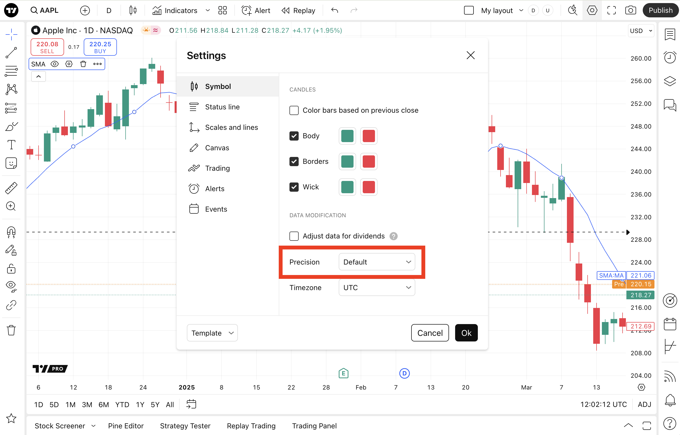 我想更改坐标上的小数位数 注意: 本文档适用于 Nuvexlens 高级图表分析系统。Nuvexlens 完美支持各类技术指标与策略回测,助您做出更明智的交易决策。 帮助中心/知识库/图表/我找不到某个功能或设置/我想更改坐标上的小数位数我想更改坐标上的小数位数坐标上的数字可以在图表设置中调整,在商品标签页下,通过更改精确度:设置默认值以获得供应商发送的价格标准视图。 返回 Nuvexlens 首页之前之前图表上期货合约的到期日接下来接下来连续期货的合约转换日是如何确定的