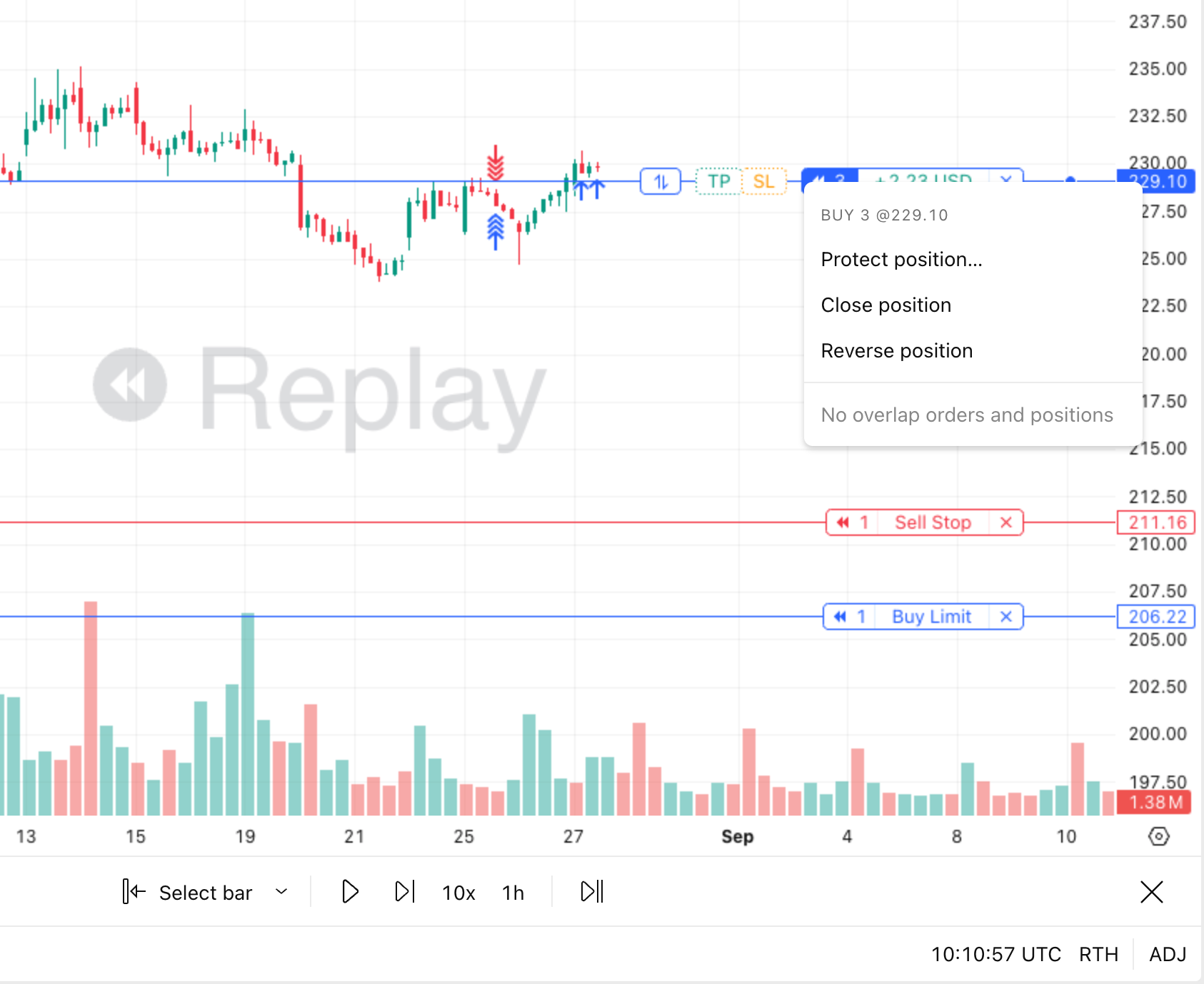 选择起始点后,即可立即基于历史数据进行交易。您可以开仓并下达限价单、止损单和止损限价单,就像在真实经纪商那里一样。要进行交易,请使用图表左上角的“买入”和“卖出”按钮、图表上的加号菜单或订单标签,点击“交易”即可打开。
