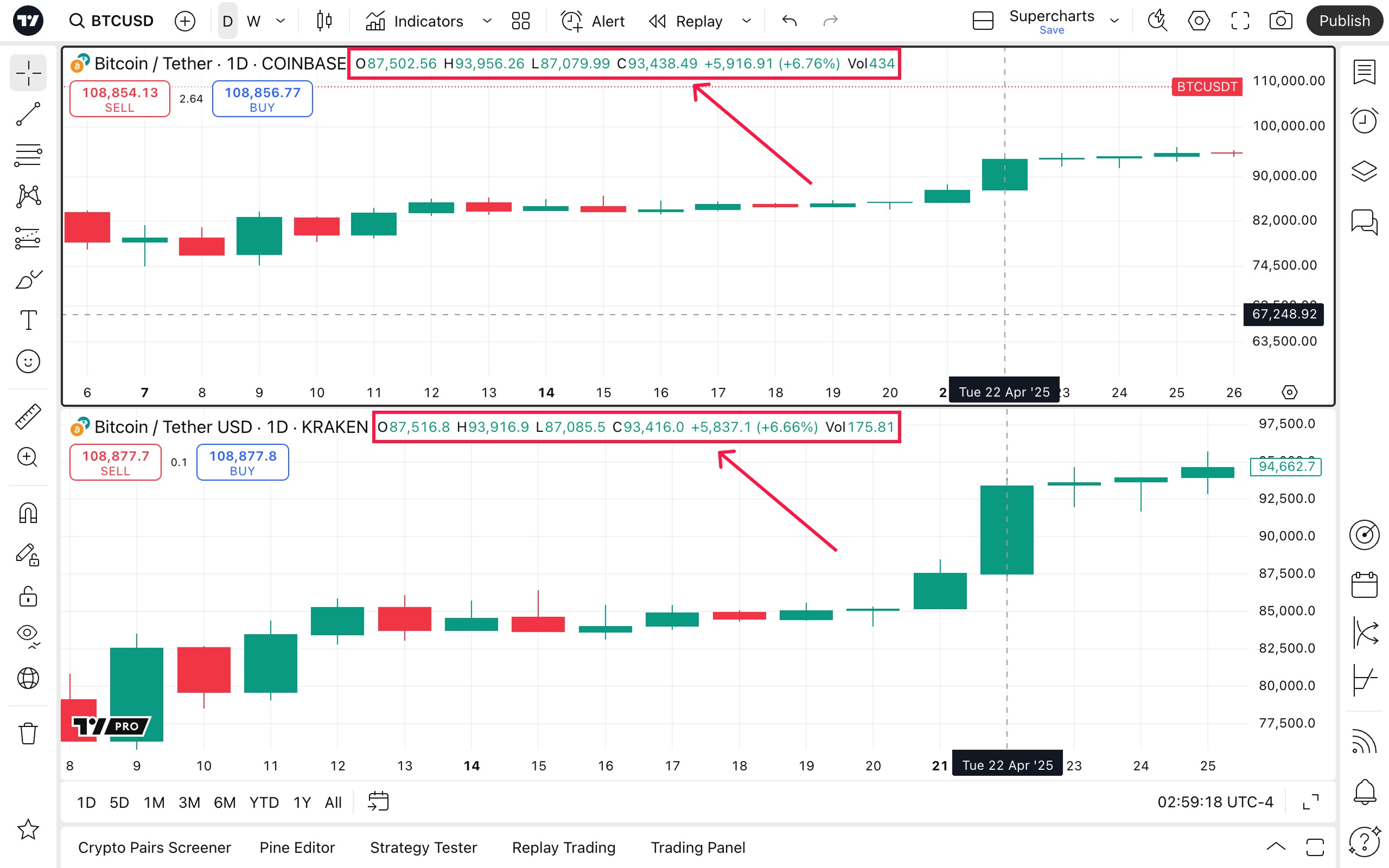 例如,如果您打开一个包含Kraken和Coinbas数据的比特币图表,并对每个图表应用相同的图表类型,您将看到不同的图表。这是因为图表类型反映的是特定交易所的数据——Kraken 和 Coinbase 上的交易者下单不同,从而导致价格不同。