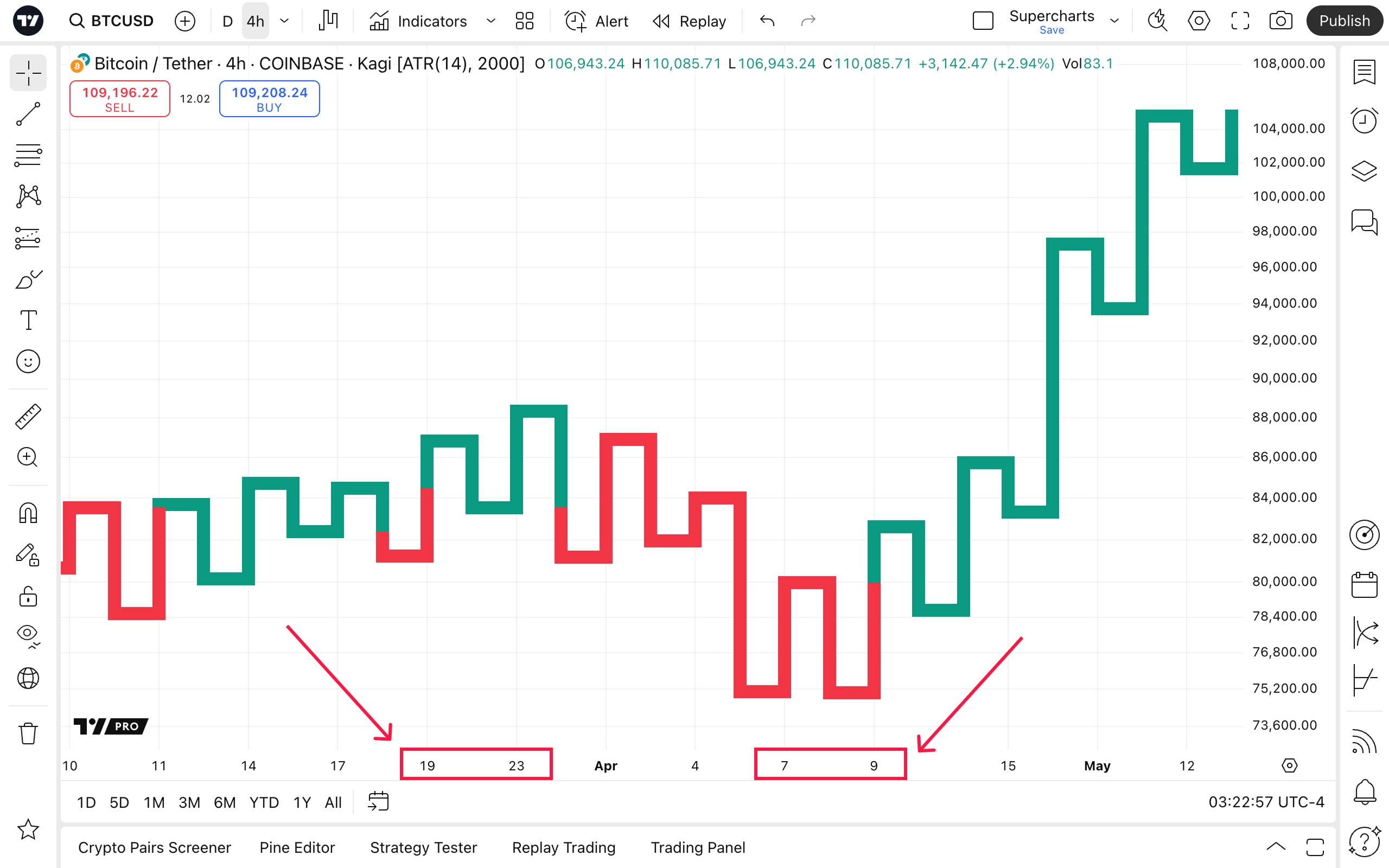 例如,只要价格持续下跌或上涨,卡吉图就会绘制垂直线和水平线。在屏幕截图中,您可以看到图表上网格线之间的相同距离在一个区域占六天,而在另一个区域占三天。这是因为在这六天期间,价格方向变化不够,因此图表没有绘制新的卡吉线。