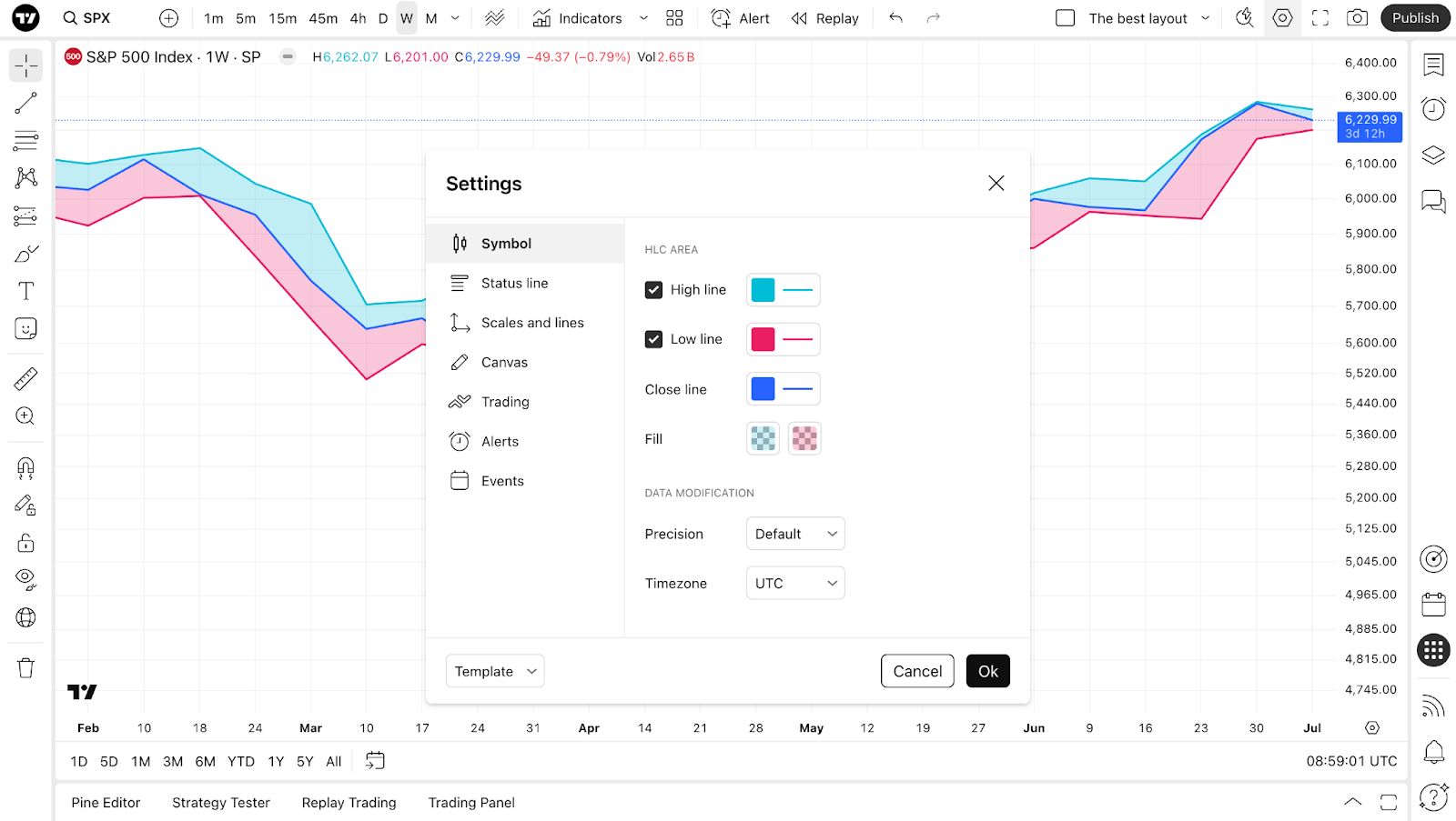 HLC区域图填充在三个最关键的价格点范围内。超级图表提供此图表类型,您可以使用它来突出显示资产的波动性。