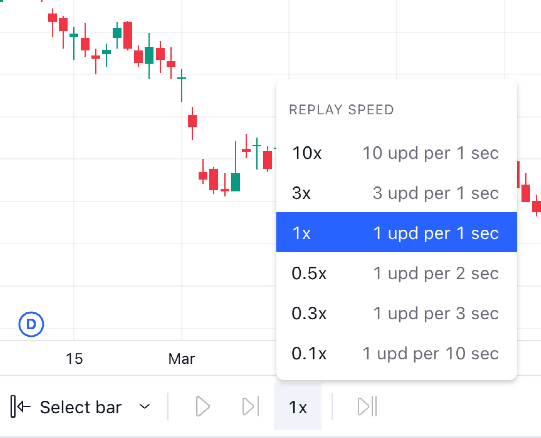 因此,您可以从“选择日期”菜单中,从可用历史记录中的第一根K线或任何其他K线开始回放。