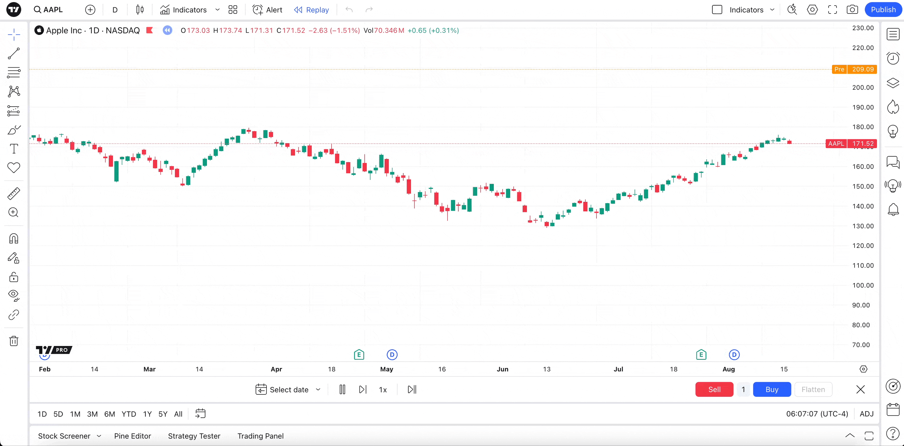 例如,如果您以日周期回放苹果股票,则每日历史记录从1980年12月12日开始,而1分钟AAPL数据从2000年1月3日开始,回放中最早的1秒K线日期为2022年8月17日。