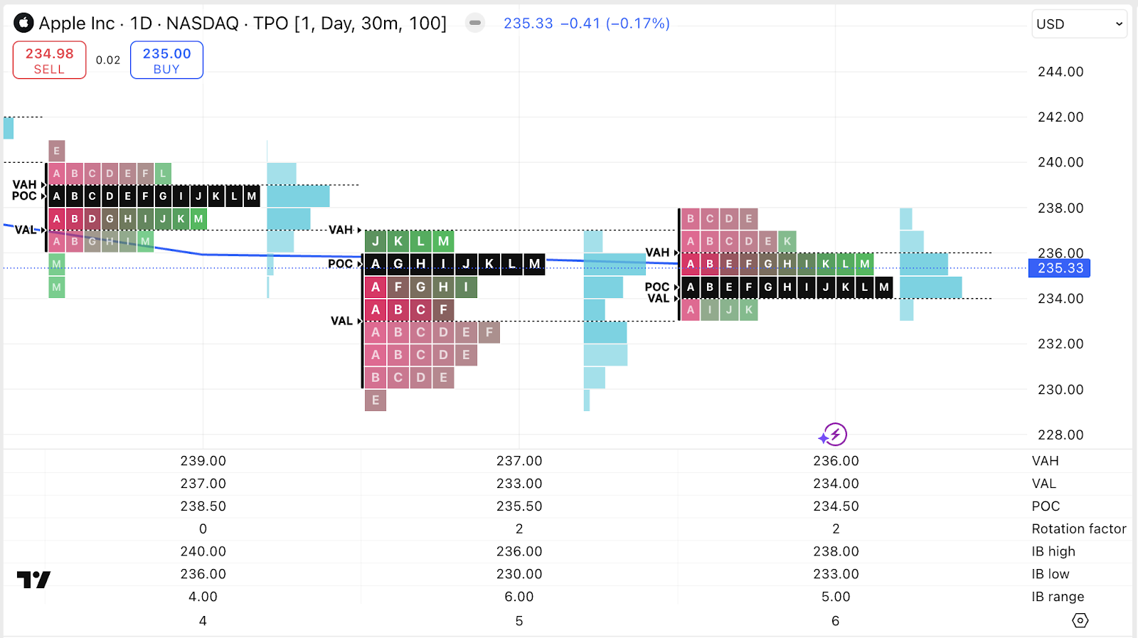 选择此输入后,TPO 图表下方将创建一个新窗格。该窗格将显示有关每个单独 TPO 计算的附加数据。