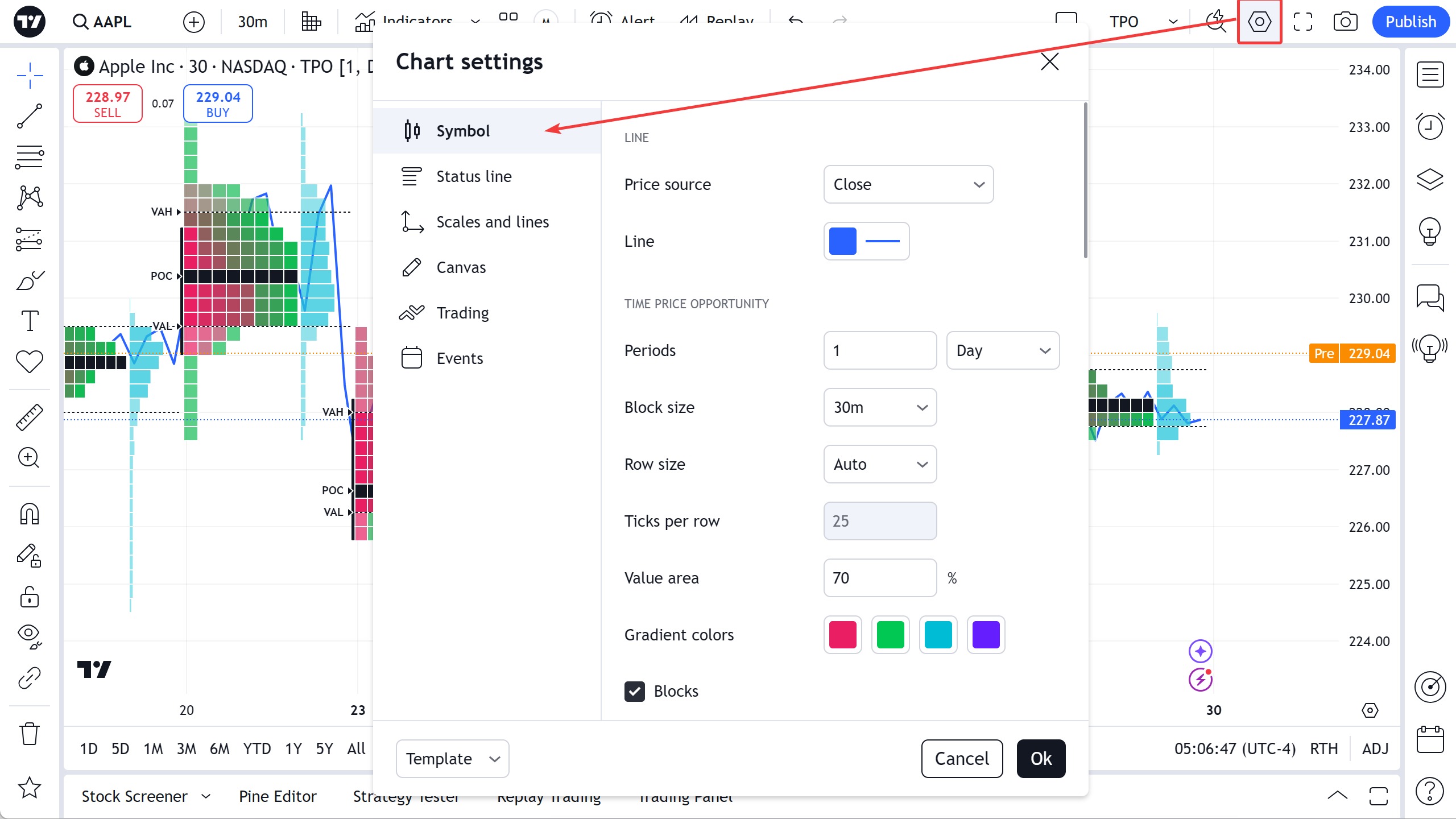 - 块 - 控制 TPO 颜色块的显示。 如果启用了字母设置,则禁用该设置将不起作用,但由于空间不足而无法显示它们。