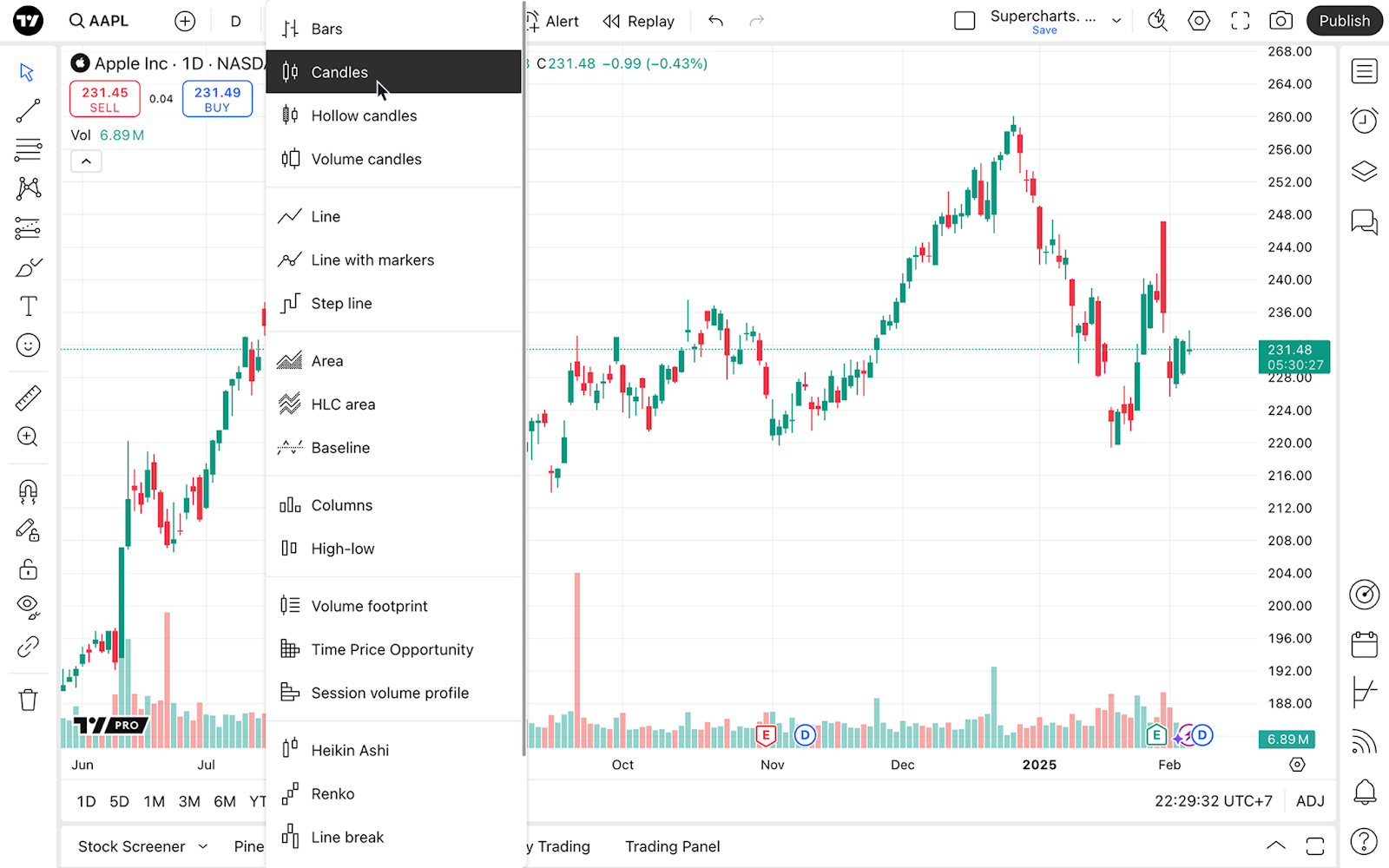 进入超级图表后,打开上方工具栏上的图表类型菜单,然后选择“K线”。