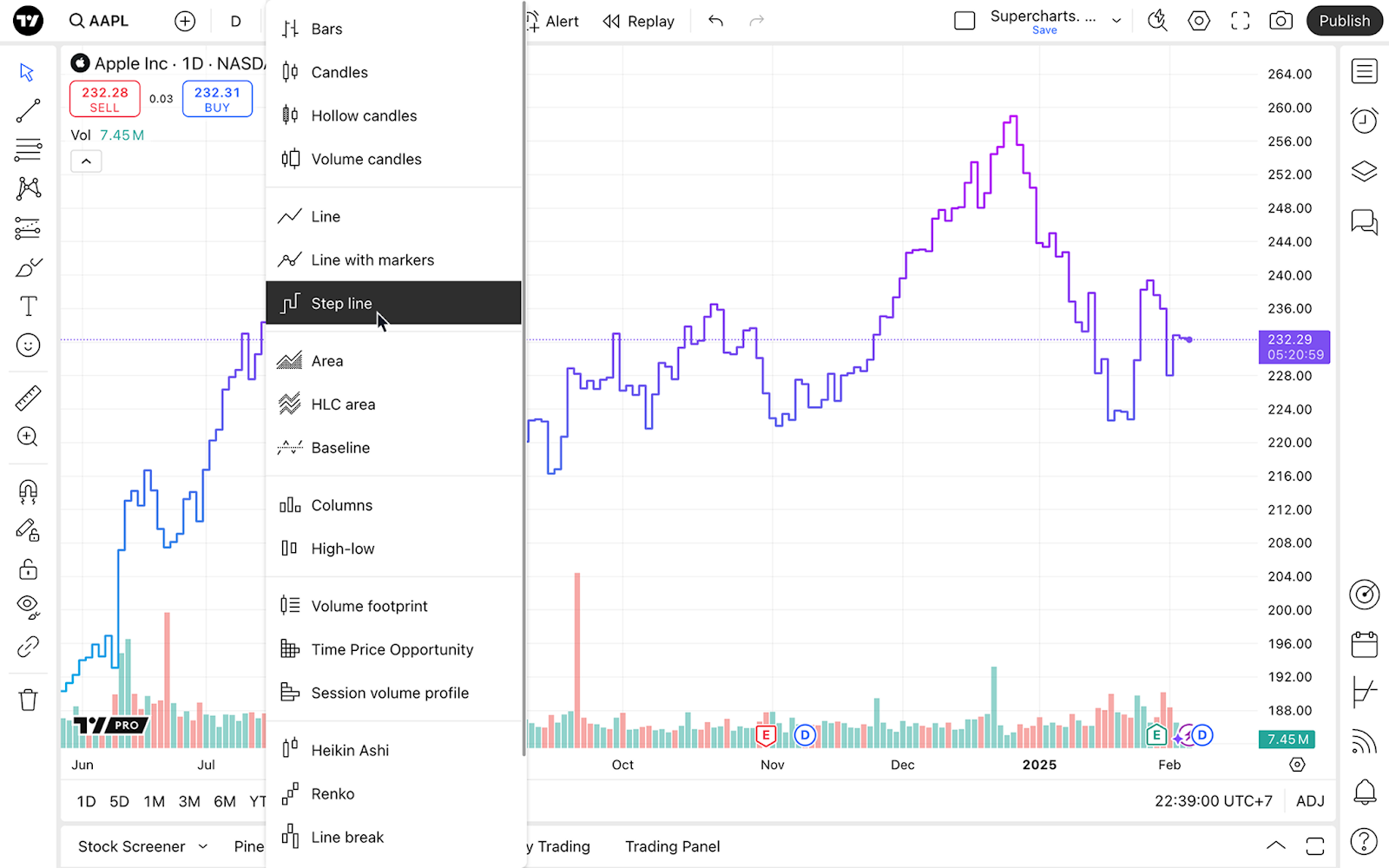 阶梯线图是一种线形图,但与原始线形图不同,它具有阶梯状的可视化效果。在这里,数据点与水平线和垂直线相连,形成代表特定时间周期价格的阶梯。