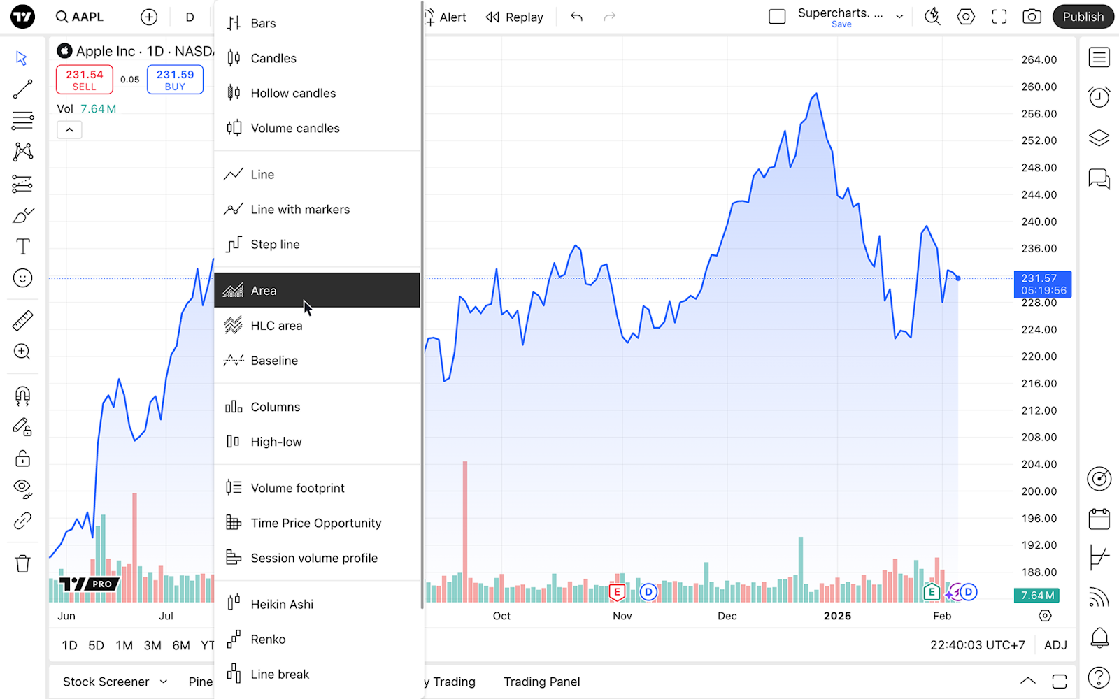 面积图是标准折线图的一种变体,只是价格线下方直到X(水平)轴的空间被阴影化,以帮助您更好地读取变化。
