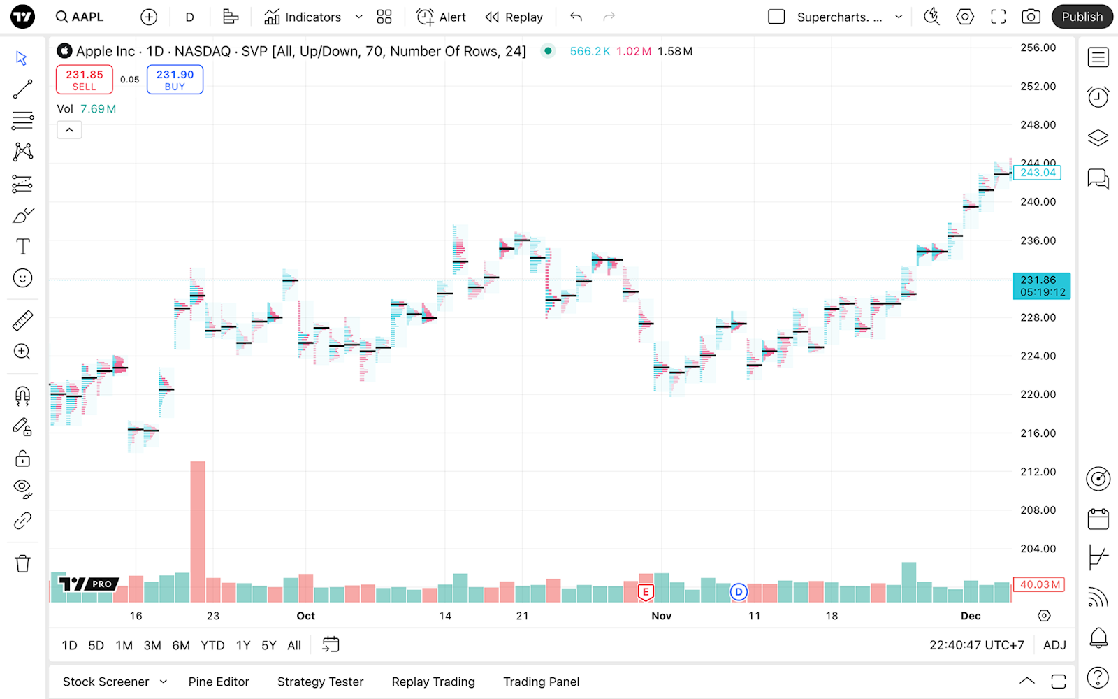 与传统的K线图或蜡烛图不同,时段成交量分布图以不同的视角展现市场:它将每个交易时段可视化为垂直成交量曲线图,从而更容易看出交易活跃度最高的时段。通过这种方式,图表突出显示了特定时段内不同价位的成交量分布情况。