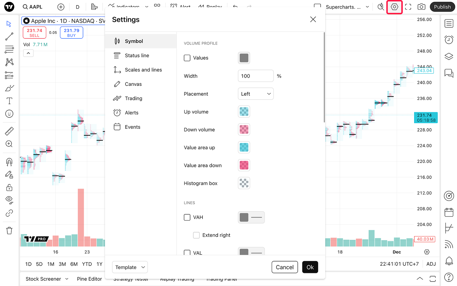 要调整您的交易时段成交量分布图表,请选择上方工具栏上的“设置”,然后转到“商品”标签页。