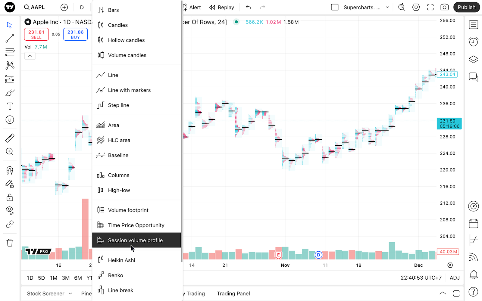 进入超级图表后,打开上方工具栏上的图表类型菜单,然后选择“交易时段成交量分布图”。