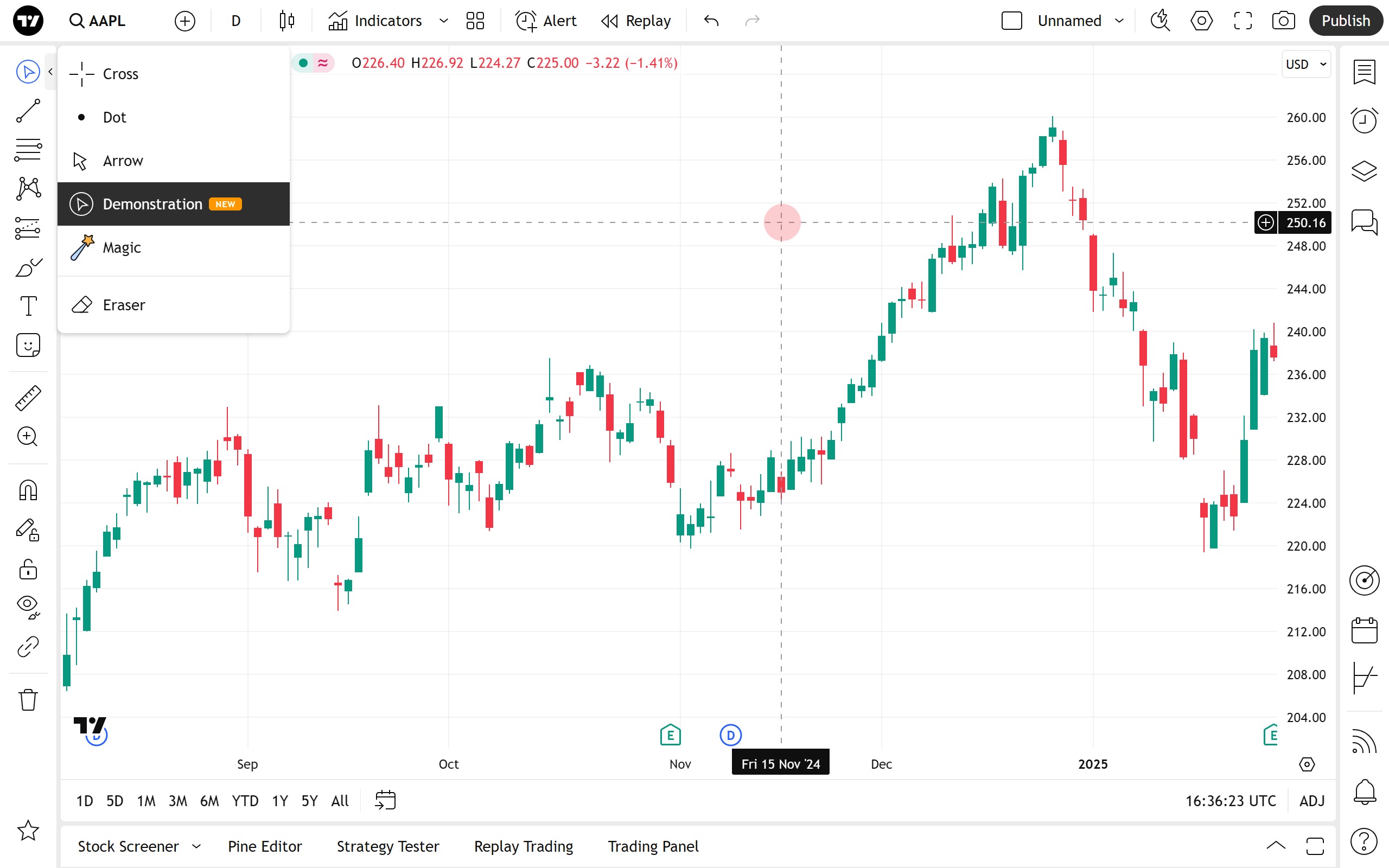 演示光标位于图表左侧绘图工具栏的“光标”菜单中。