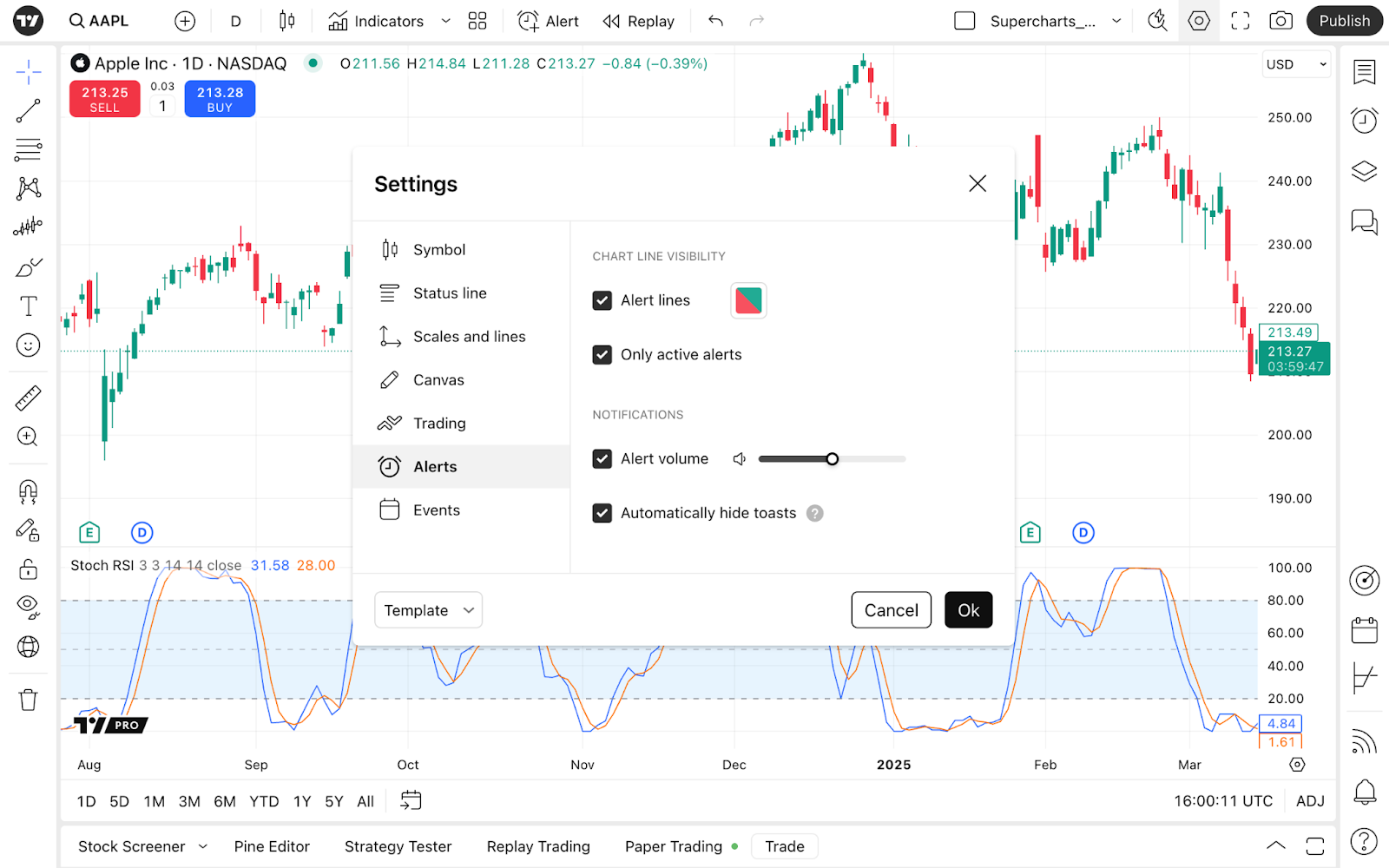 返回图表设置,选择警报线的颜色,并开启“仅限活跃警报”(如果您不想让已过期或非活跃警报打扰您的分析)。