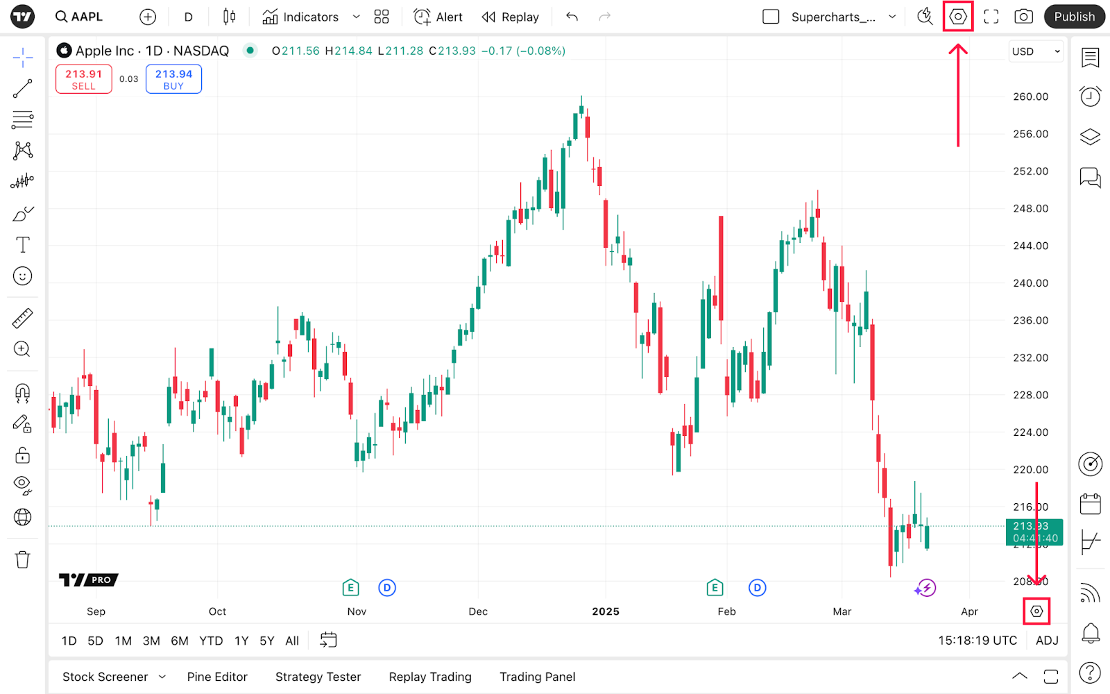 要访问图表设置,请找到上方工具栏或图表底部的齿轮按钮。您也可以双击价格线或价格K线来访问设置窗口。