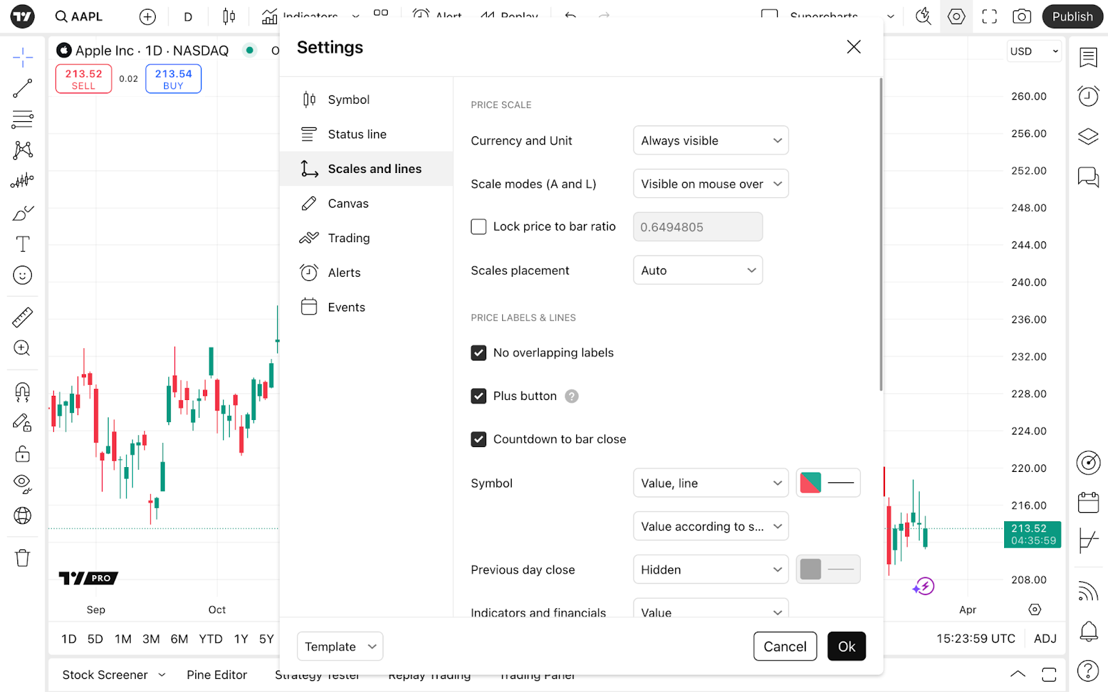 - 价格标签和线条。配置标签叠加、价格按钮以创建警报、K线收盘倒计时,以及商品值、最高/最低价和其他值的格式、可见性和颜色。