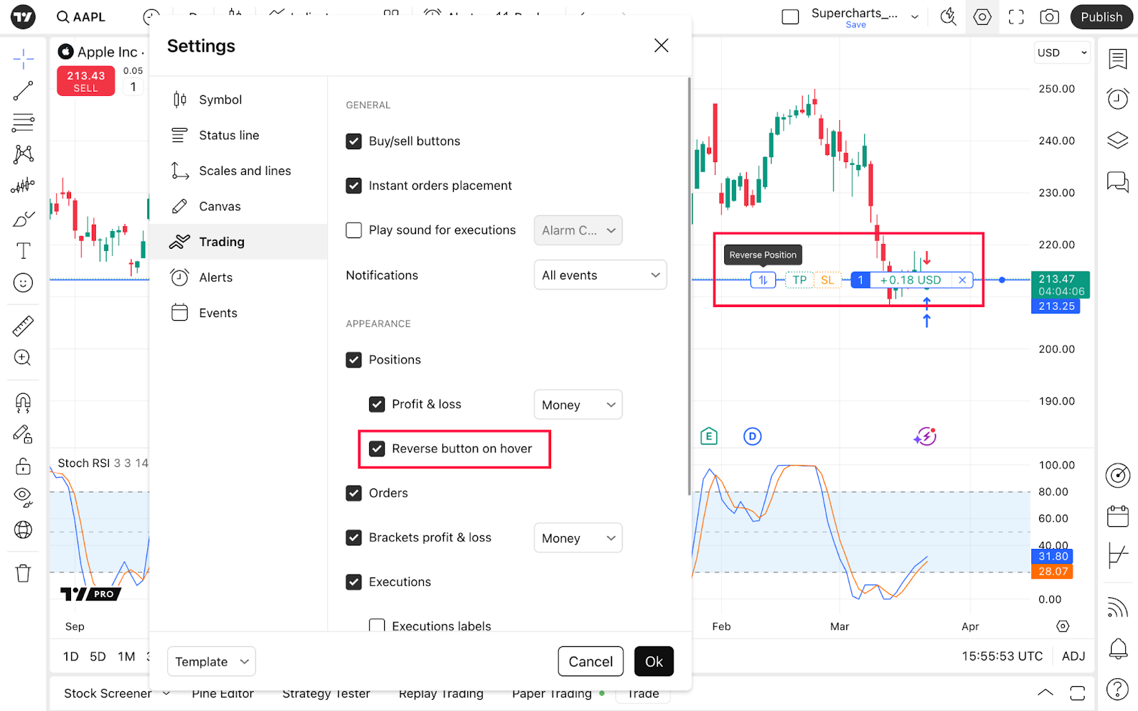 然后,悬停时会出现“反转”按钮,当您将光标悬停在价格变动值上时,该按钮会出现。这允许您立即反转仓位。此功能适用于高波动市场和剥头皮交易策略,当您没有时间填写订单详细信息并需要立即执行时。