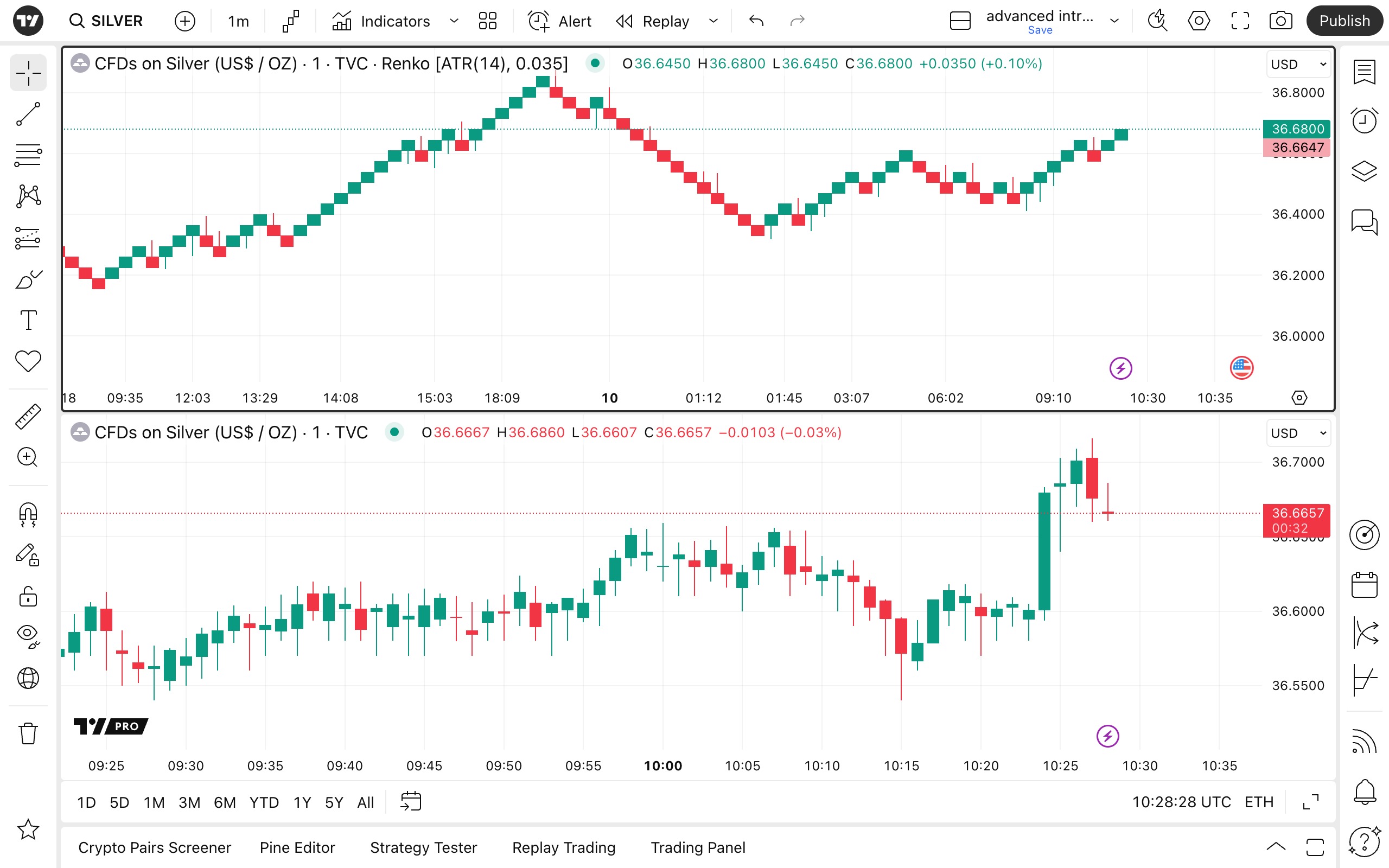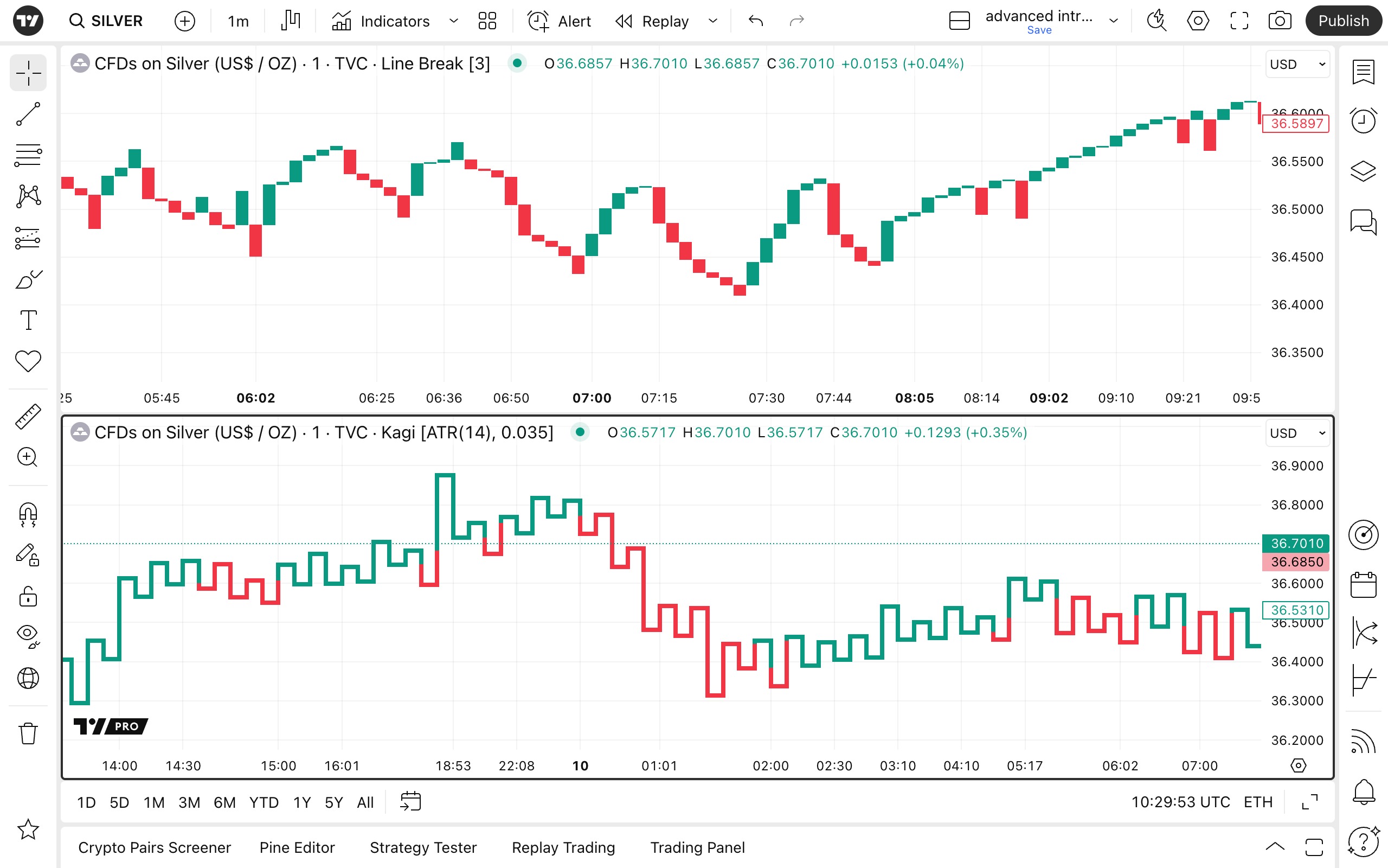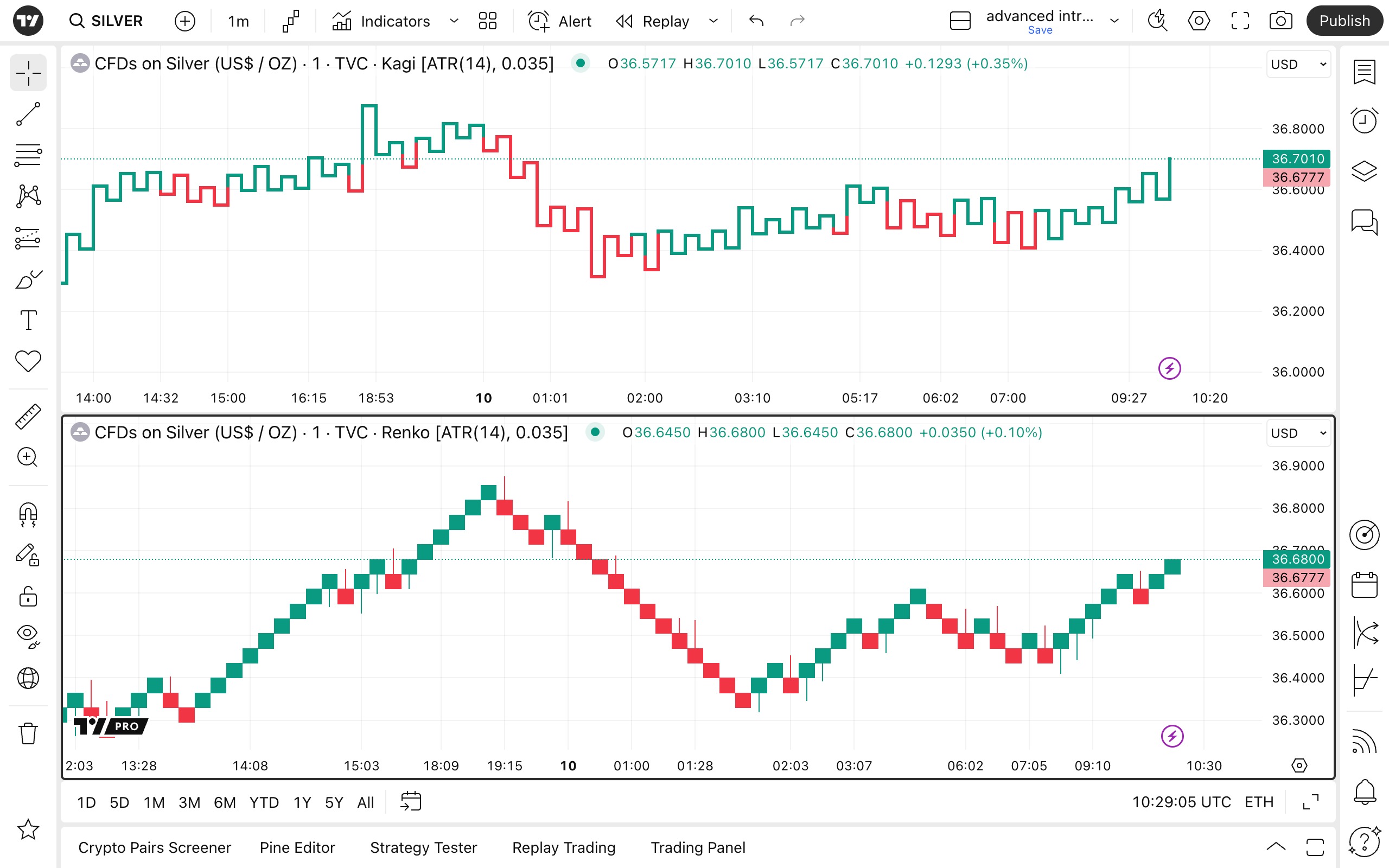 使用砖形图、卡吉图、新价线和点数图的日内功能进行分析。