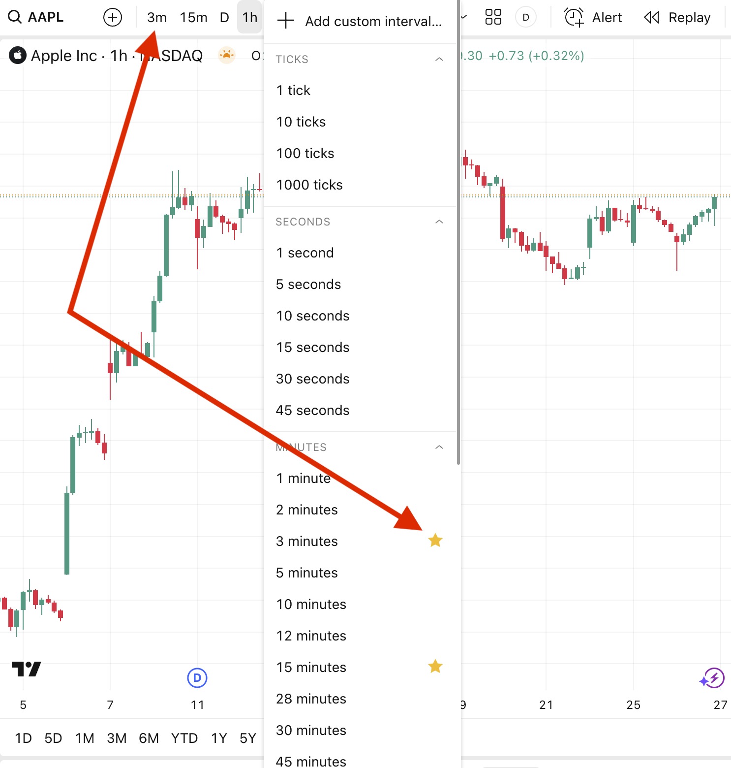 顶部的时间周期按钮代表您收藏的时间周期。您可以点击旁边的星号图标将某个时间段添加到收藏,并从顶部面板中选择该时间周期即可快速更改。