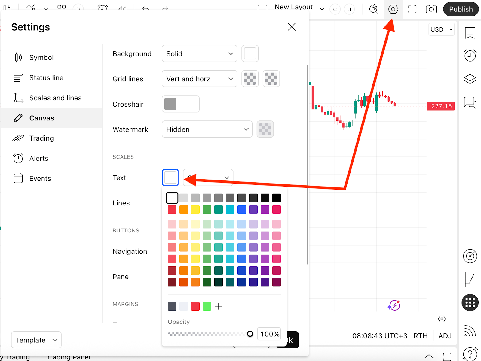 如果您仍然可以看到“A/L”按钮或“货币和单位”框,则文本颜色可能与背景颜色相同。打开画布设置并更改文本颜色。