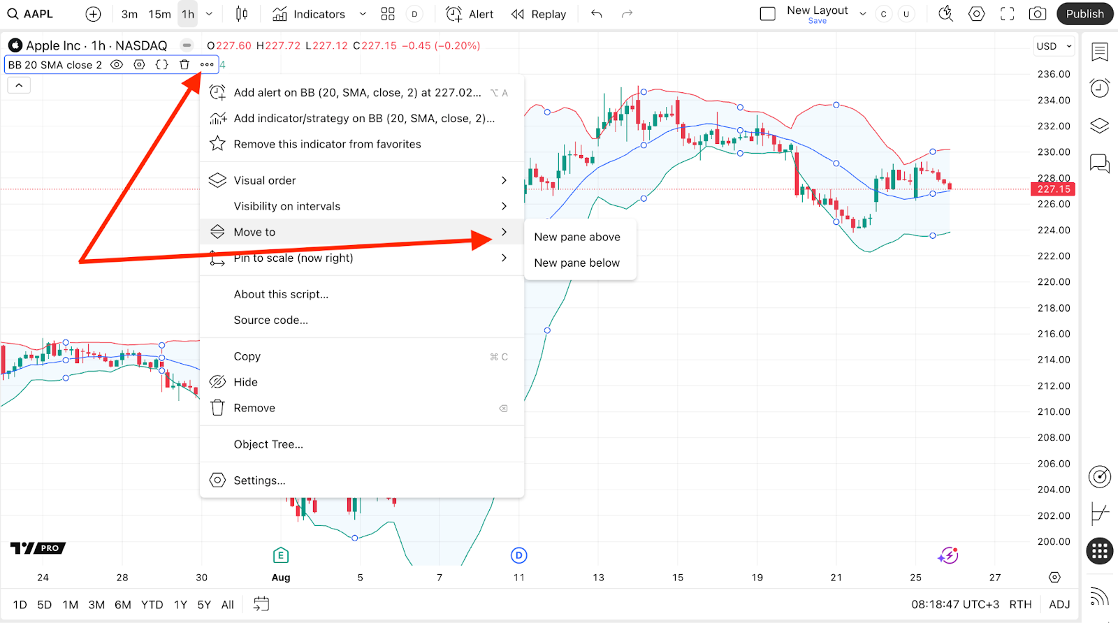 如何移动指标到主窗格有两种方法可以将指标移动到主窗格:1. 手动拖动。2. 点击三个点打开指标的右键菜单,然后选择所需的“移动到”选项。返回 Nuvexlens 首页之前之前我看不到价格坐标上的价格接下来接下来我无法删除图表上的蓝色垂直线