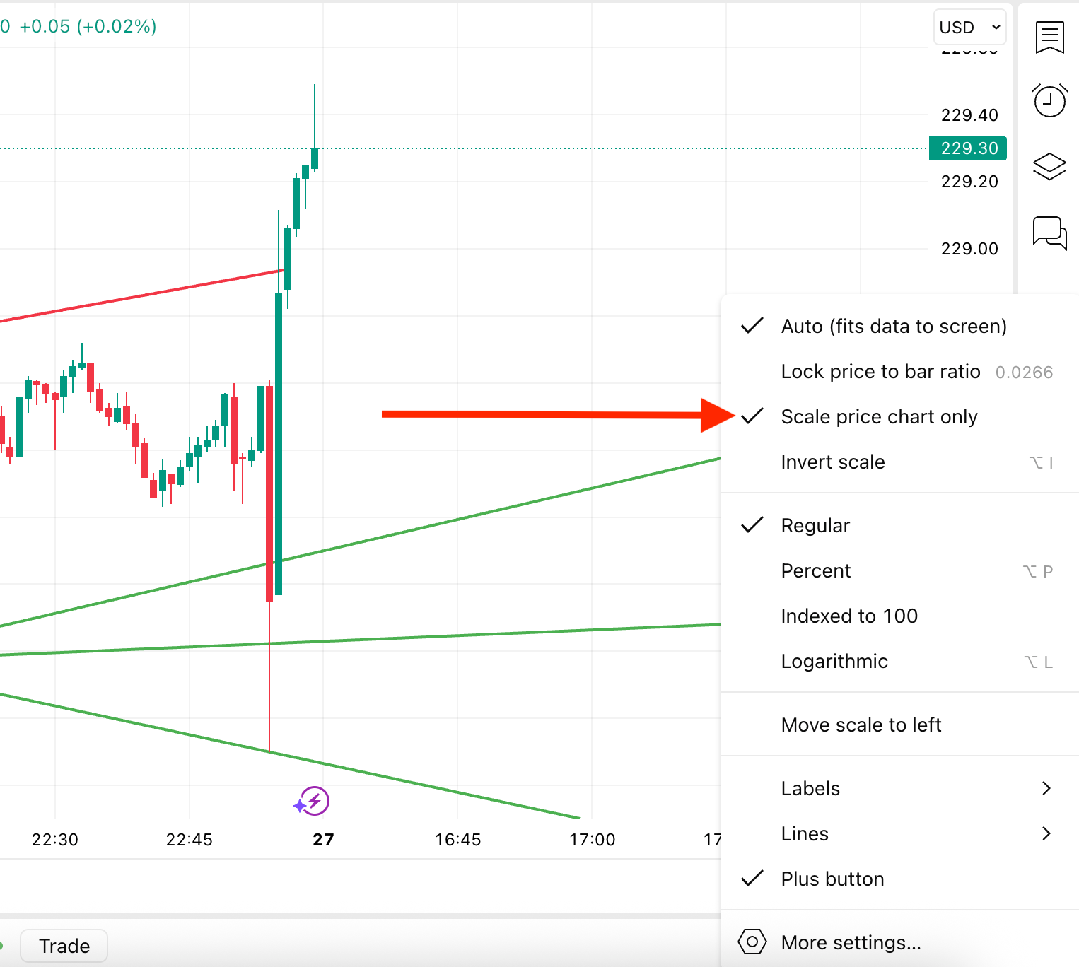 如果您使用的指标水平远离水平系列,K线图将会被压缩,因为自动缩放会强制图表将所有指标级别都放在可见区域内。要解决此问题,您可以在价格坐标的右键菜单中启用“仅缩放价格图表”选项。