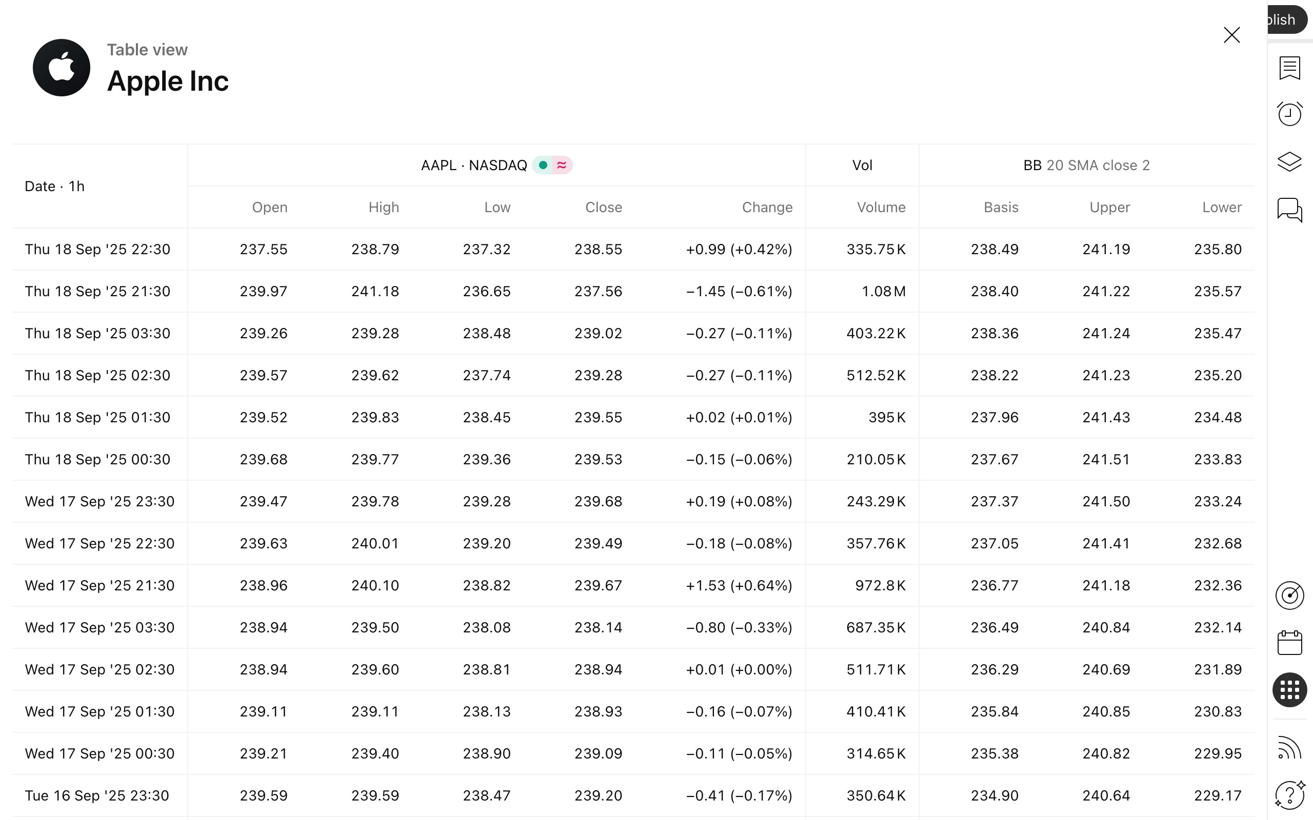 每个表格的行对应一个特定的时间点,而列则显示商品和指标的数值。这可以让您的分析更加灵活和精确,让您无需额外点击即可比较数值、跟踪变化并发现趋势。