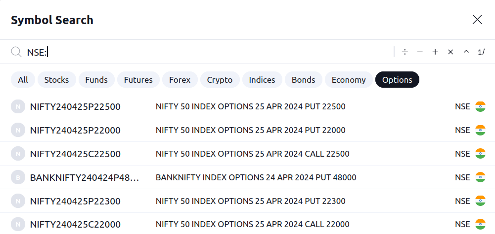 NSE 选项在商品代码搜索中可用。要访问此数据,请导航至商品代码搜索,打开“选项”标签页,然后输入交易所前缀“NSE:”