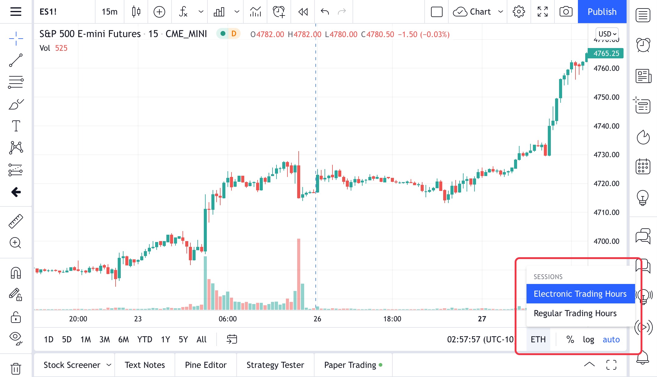 - 常规交易时段 (RTH) 是缩短的时段,在 08:30-15:15 CT 之间显示数据。