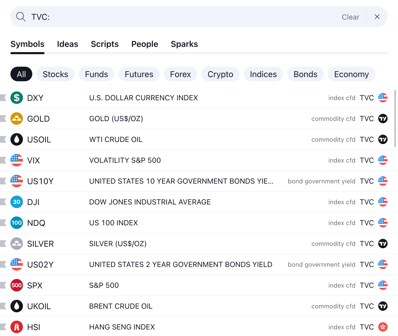 TVC: 前缀下的商品通常是差价合约和基于其他流行工具的工具,例如指数和商品:美元指数、标准普尔 500、黄金等。尽管原始工具的图表和TVC图表看起来相似,但比较它们是不正确的,因为它们有不同的数据源。